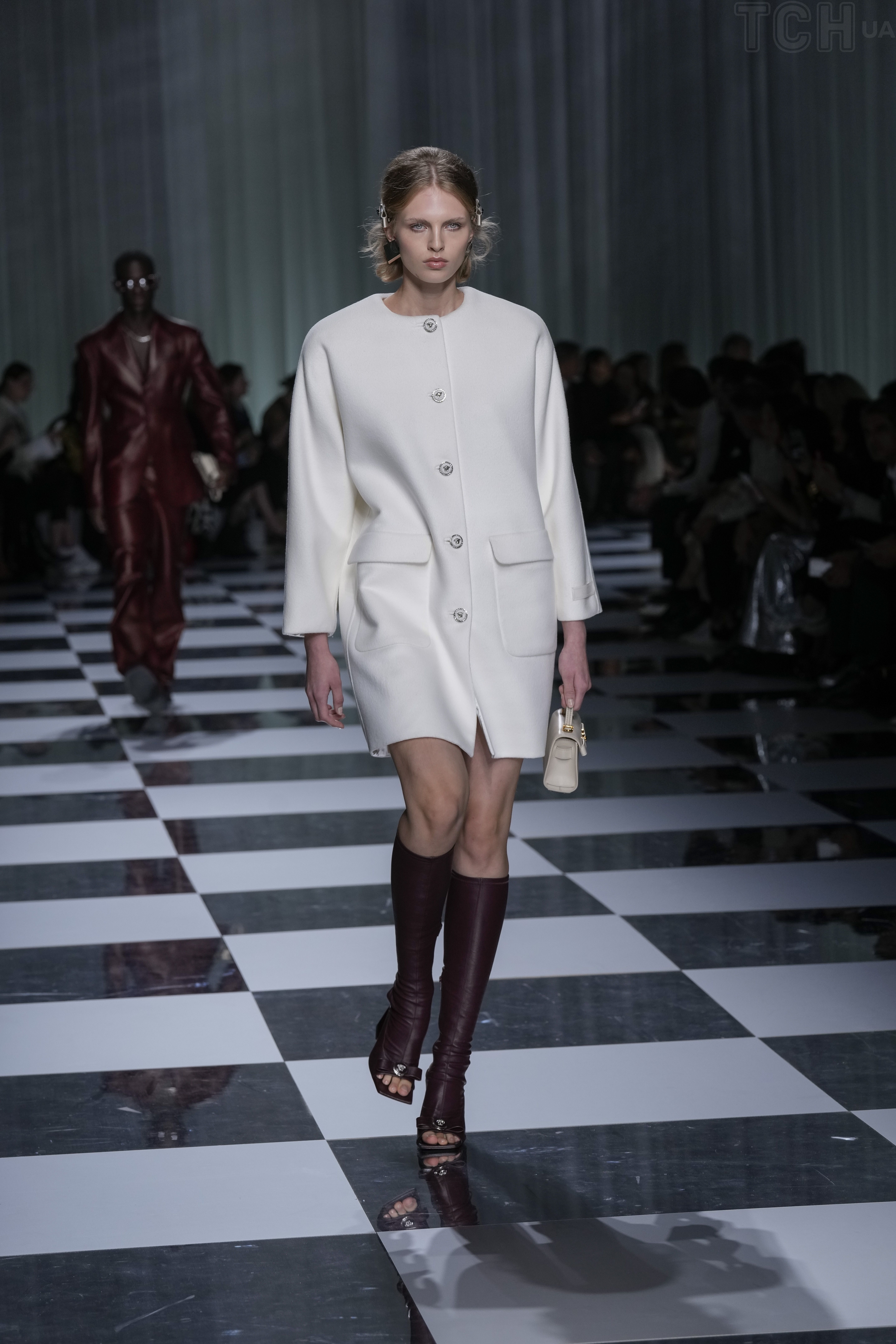 При создании нарядов Версаче вдохновлялась осенней коллекцией 1995 года, которую создал для бренда ее брат Джанни. Поэтому на подиуме можно увидеть наряды в нежных оттенках, мини-платья из плотной атласной и шелковой ткани, укороченные жакеты и мини-юбки.