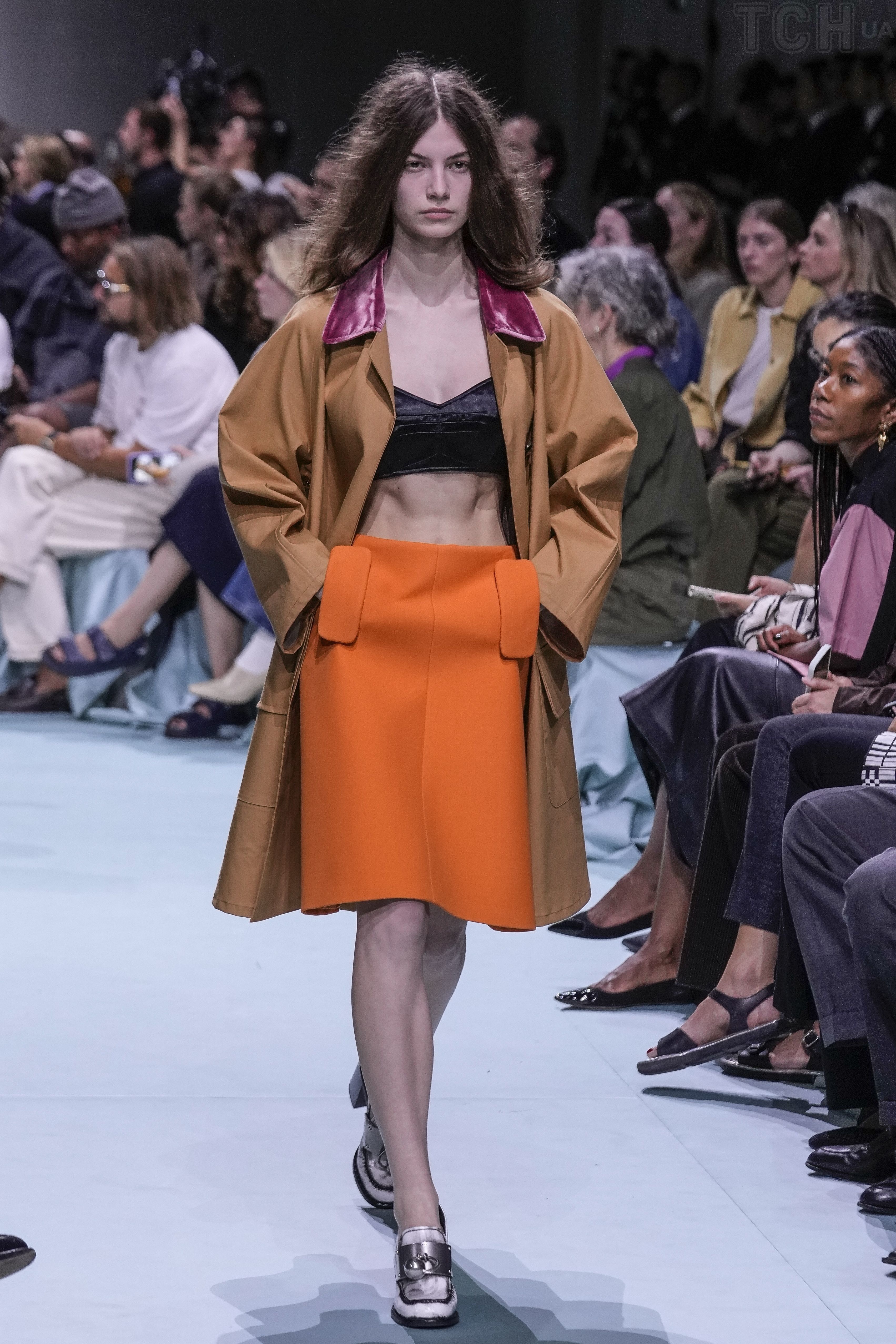 Как и многие другие марки, Prada предлагает в новом сезоне шорты-трусы, боди и прямые плащи. Яркости коллекции также добавили колготки разных оттенков.