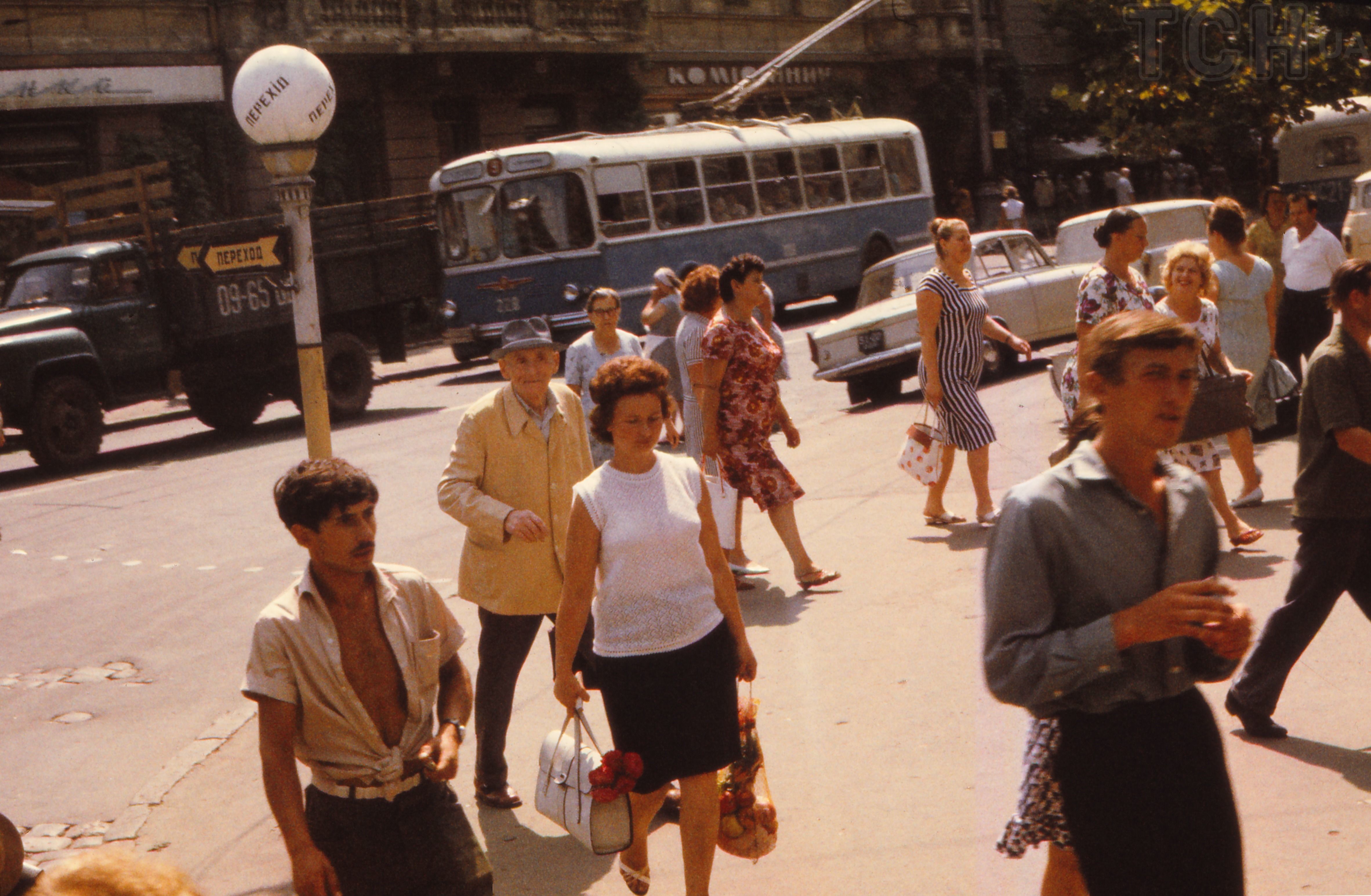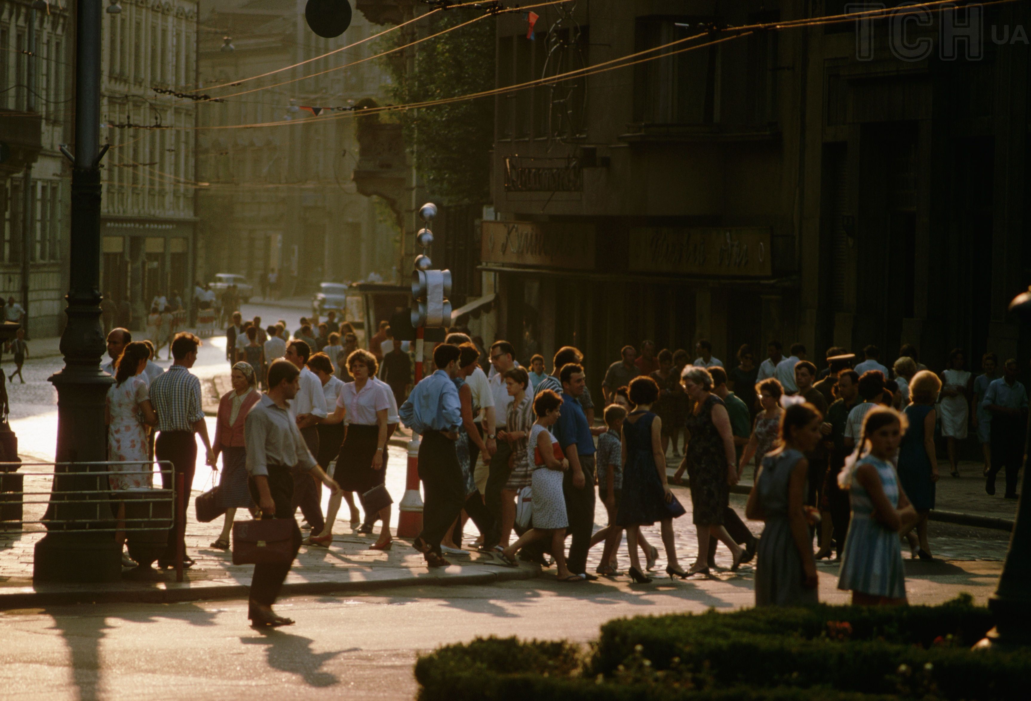 Это фотография конца 60-х годов и брюк в то время на женщинах не увидеть, однако платья все очень яркие. Длина юбки не доходит выше колен, но несмотря на львовскую брущатку, практически все дамы на каблуках.