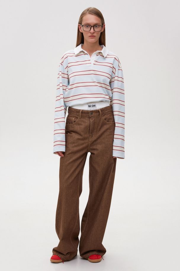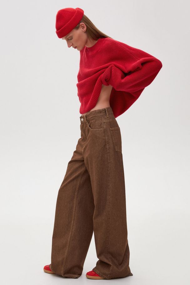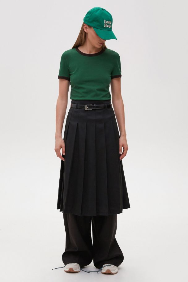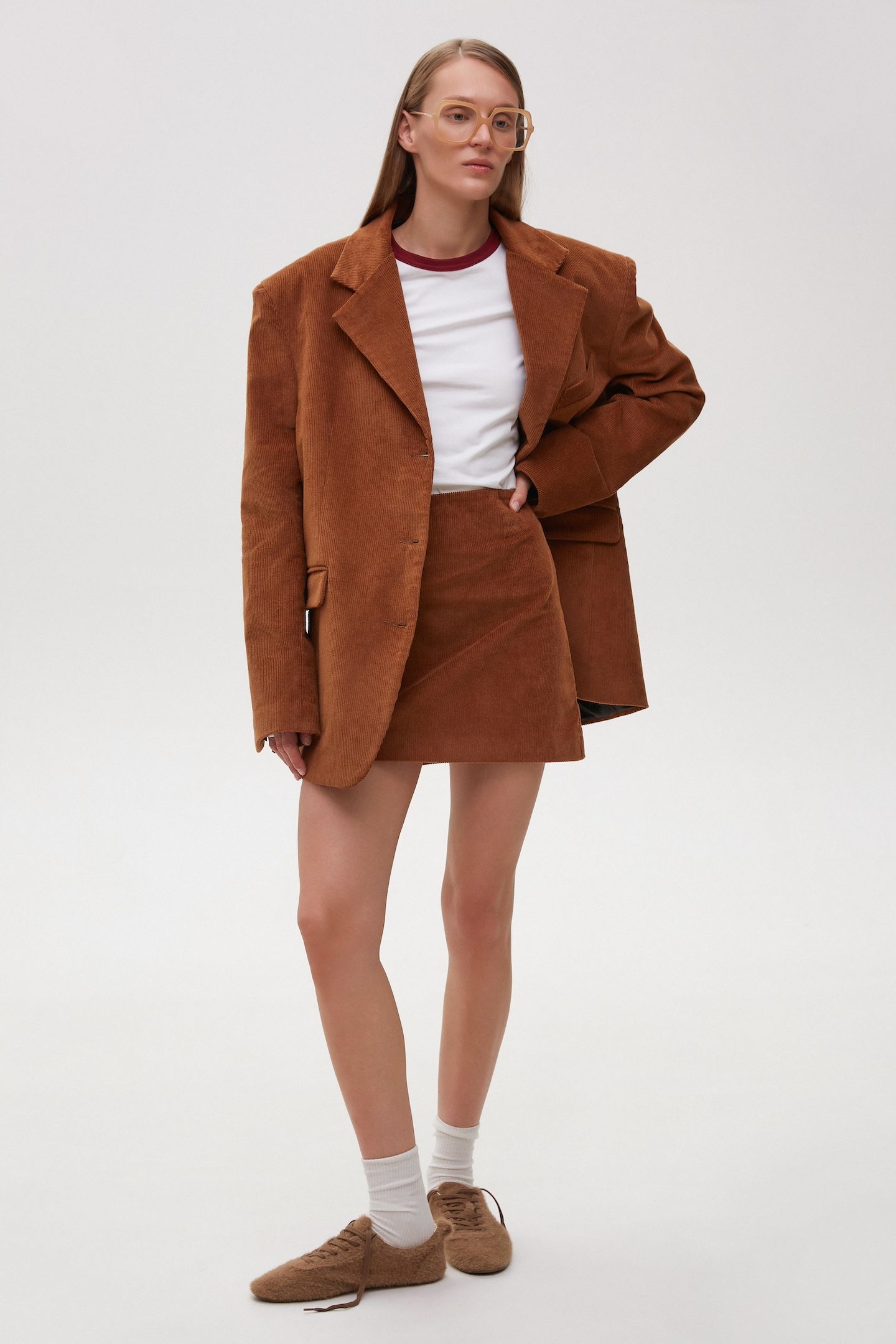 Юбки-плиссе длины миди и мини-юбки (коричневые и в полоску) прекрасно дополняют свитера и базовые футболки, создают готовый smart casual лук вместе с объемными жакетами.