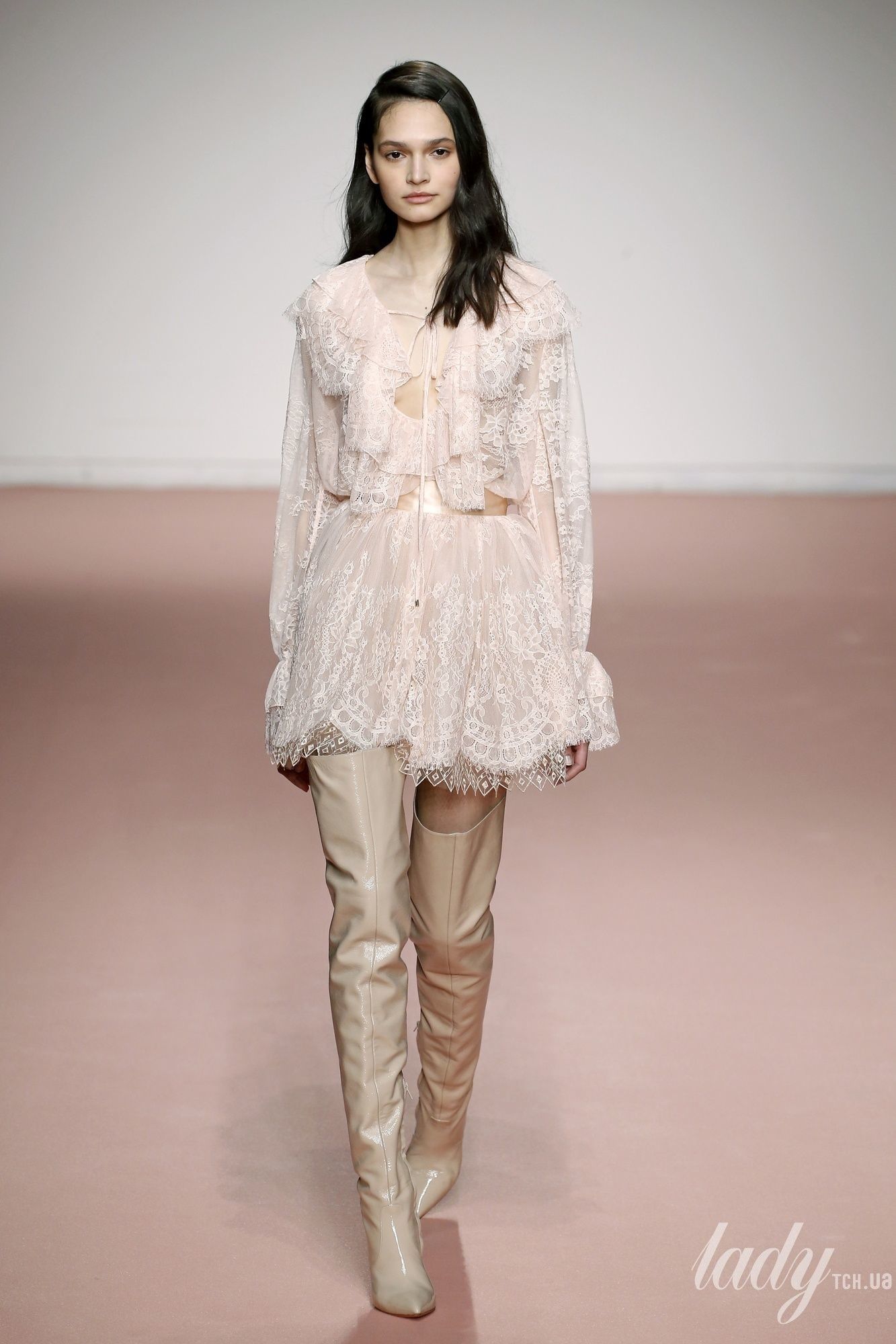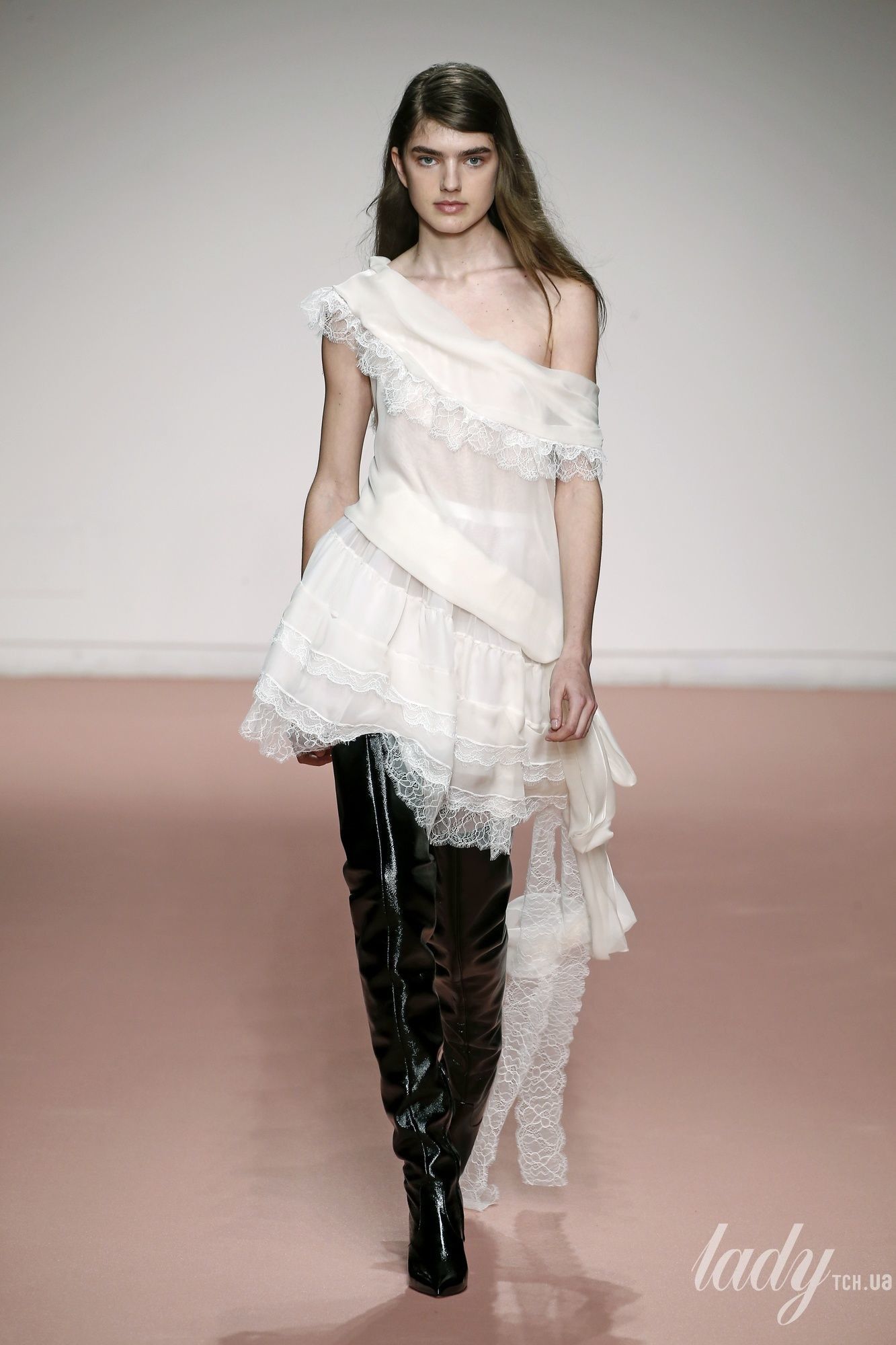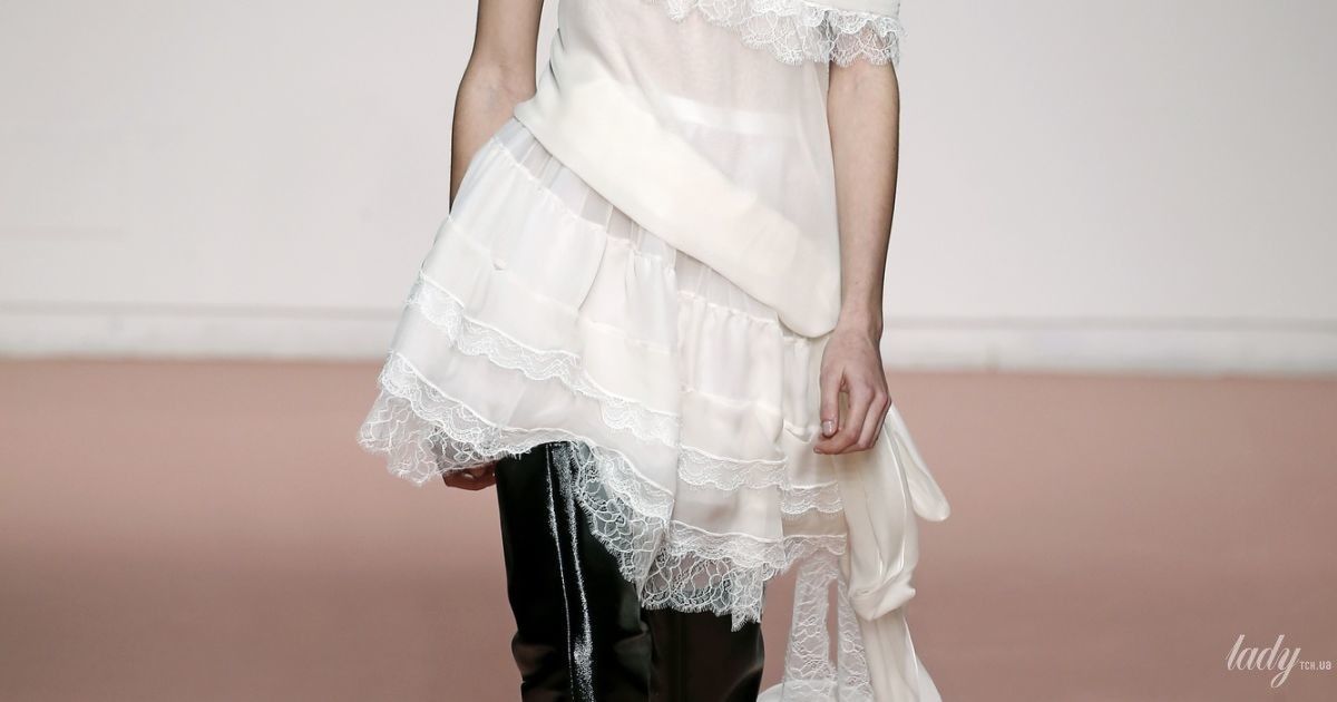 Легкие, кружевные, полупрозрачные платья в бельевом стиле предлагается носить с грубоватыми высокими черными лаковыми ботфортами.