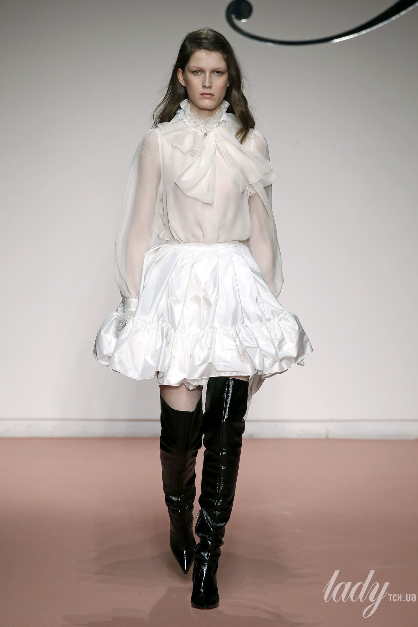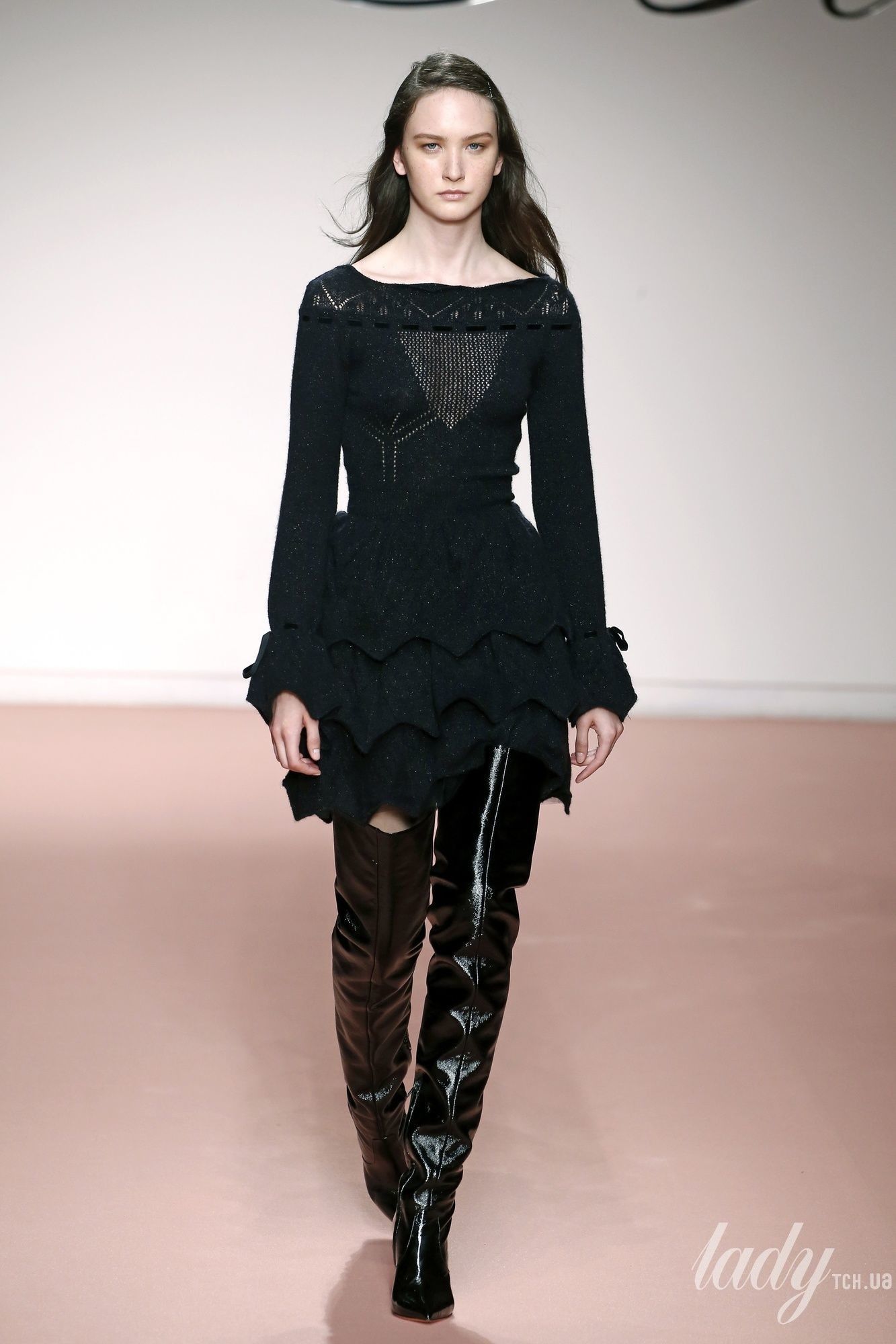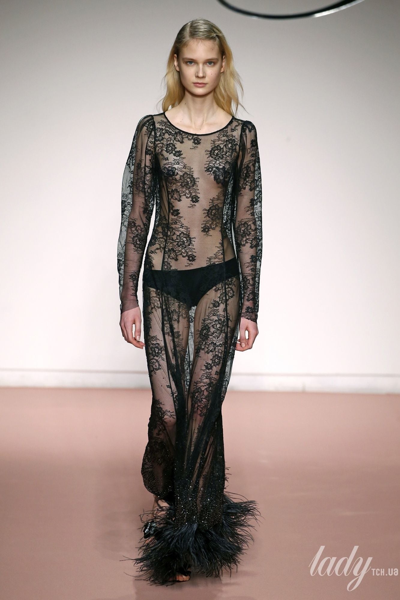 Легкие, кружевные, полупрозрачные платья в бельевом стиле предлагается носить с грубоватыми высокими черными лаковыми ботфортами.