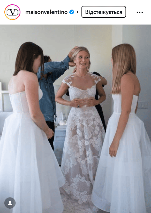 Актриса Гвинет Пэлтроу давно является подругой Модного дома Valentino, поэтому неудивительно, что для свадьбы она выбрала именно дизайн от этого бренда. Это было нежное и практически невесомое платье А-силуэта, с прозрачным декольте, цветочным кружевом и вырезом на спине. Ткань для наряда была выбрана не белая, а нежно-розового цвета, что делало образ чрезвычайно элегантным и романтичным.
