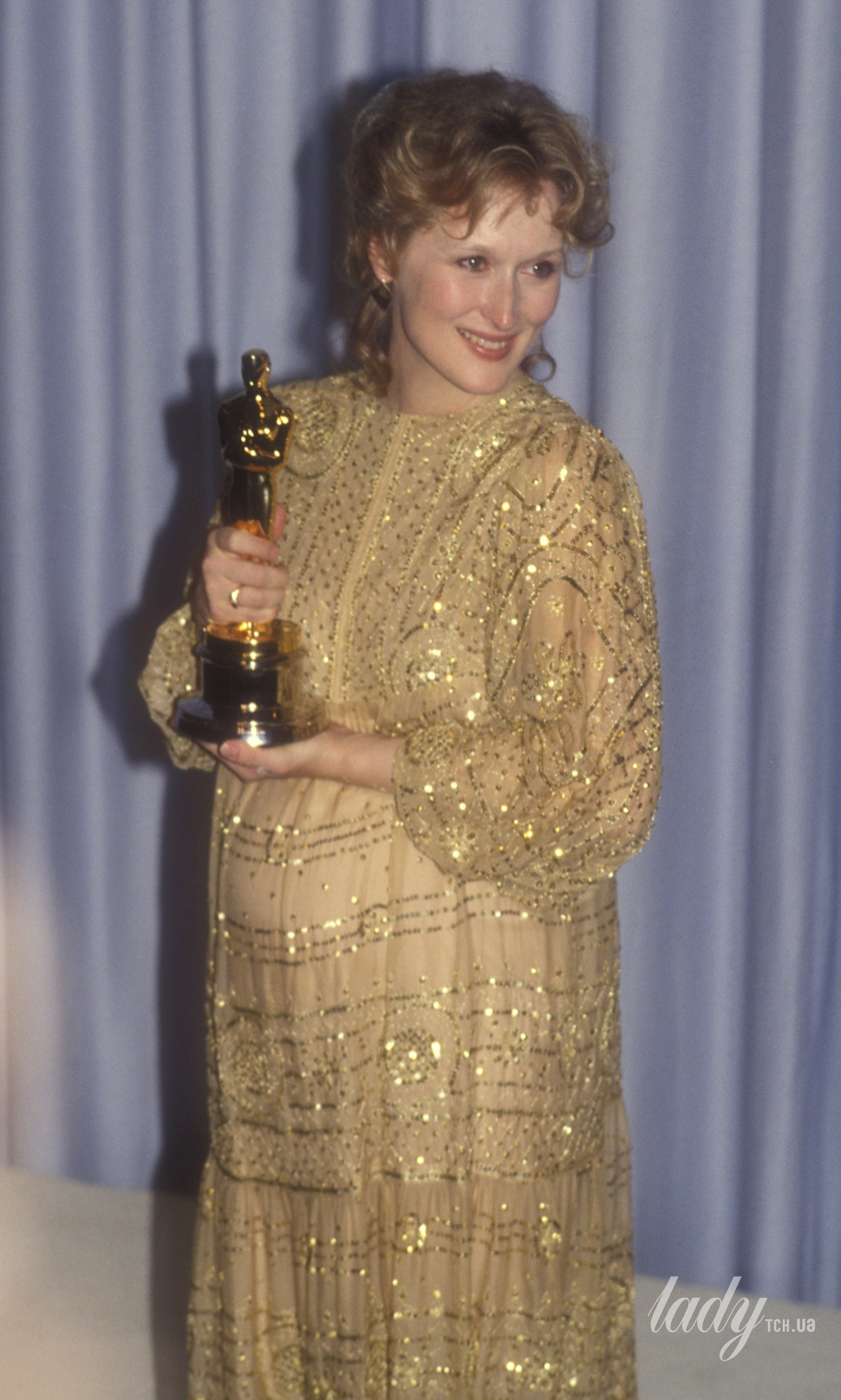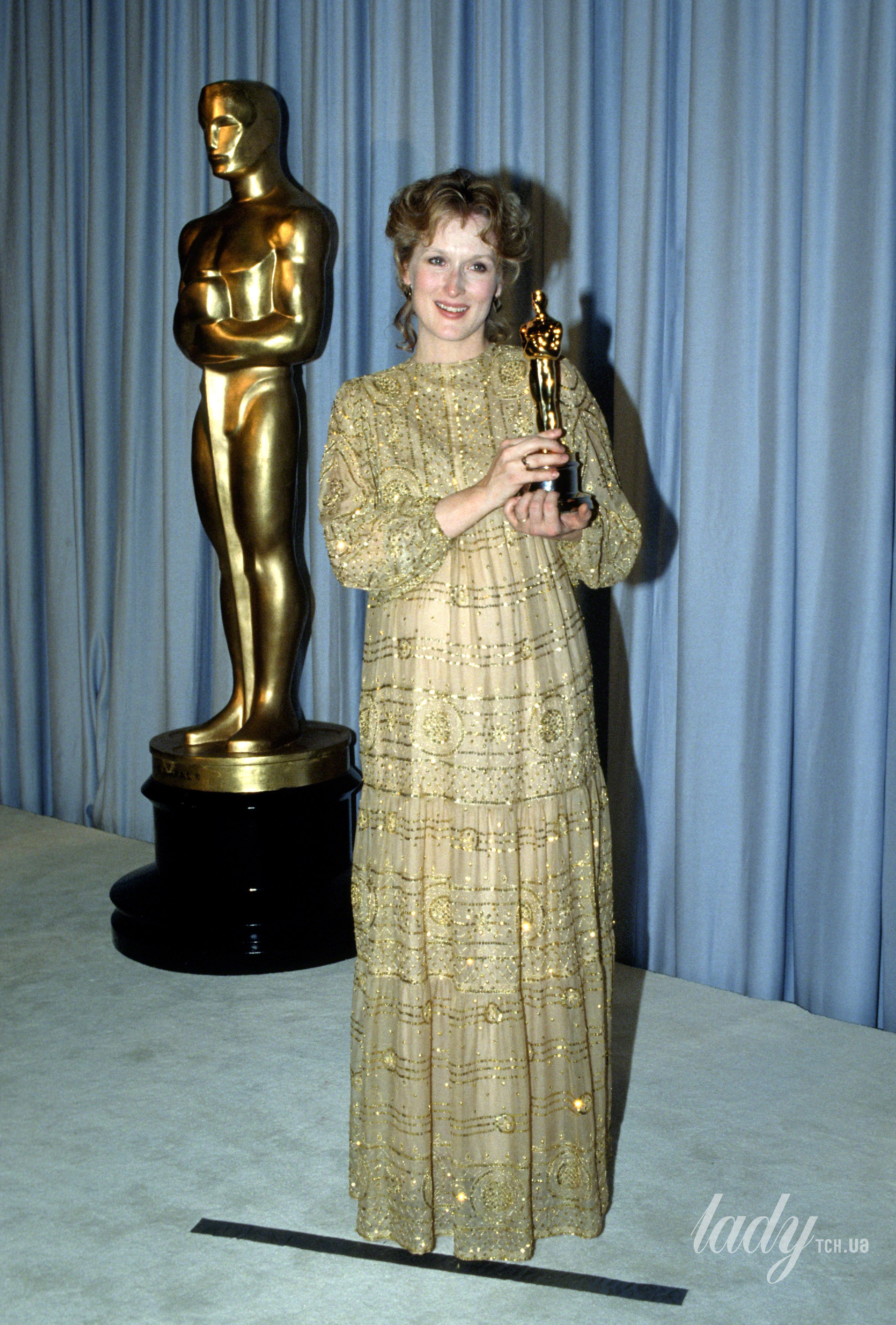 В 1983 году Мерил Стрип была номинирована на свою четвертую премию «Оскар» и ждала второго ребенка. Вероятно в тот вечер актриса не ожидала, что победит, однако золотая статуэтка снова была ее и прекрасно подходила к ее изысканному золотому платью свободного фасона и украшенному пайетками и бисером.