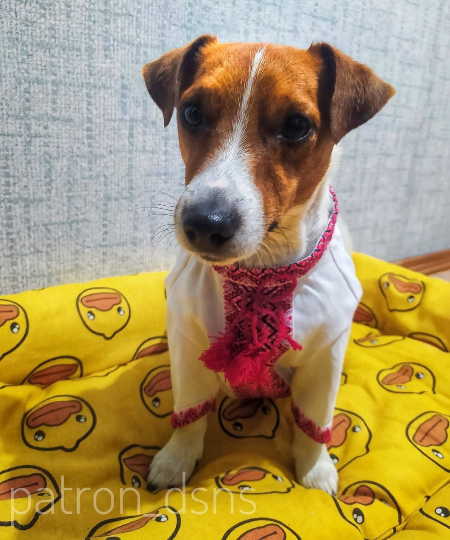 Смелый служебный пес Патрон, ставший звездой соцсетей, похвастался в Instagram подарком от своей подписницы – красивой вышиванкой. Джек-рассел-терьер примерил обновку, в которой его сфотографировал его владелец.