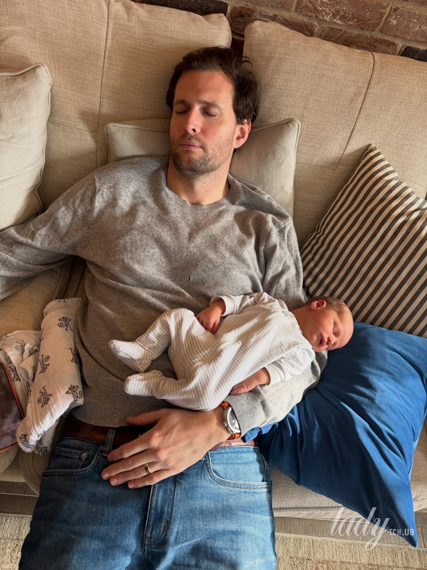 На фотографии Сэм спит на диване со своим новорожденным сыном Финном, который родился в марте.