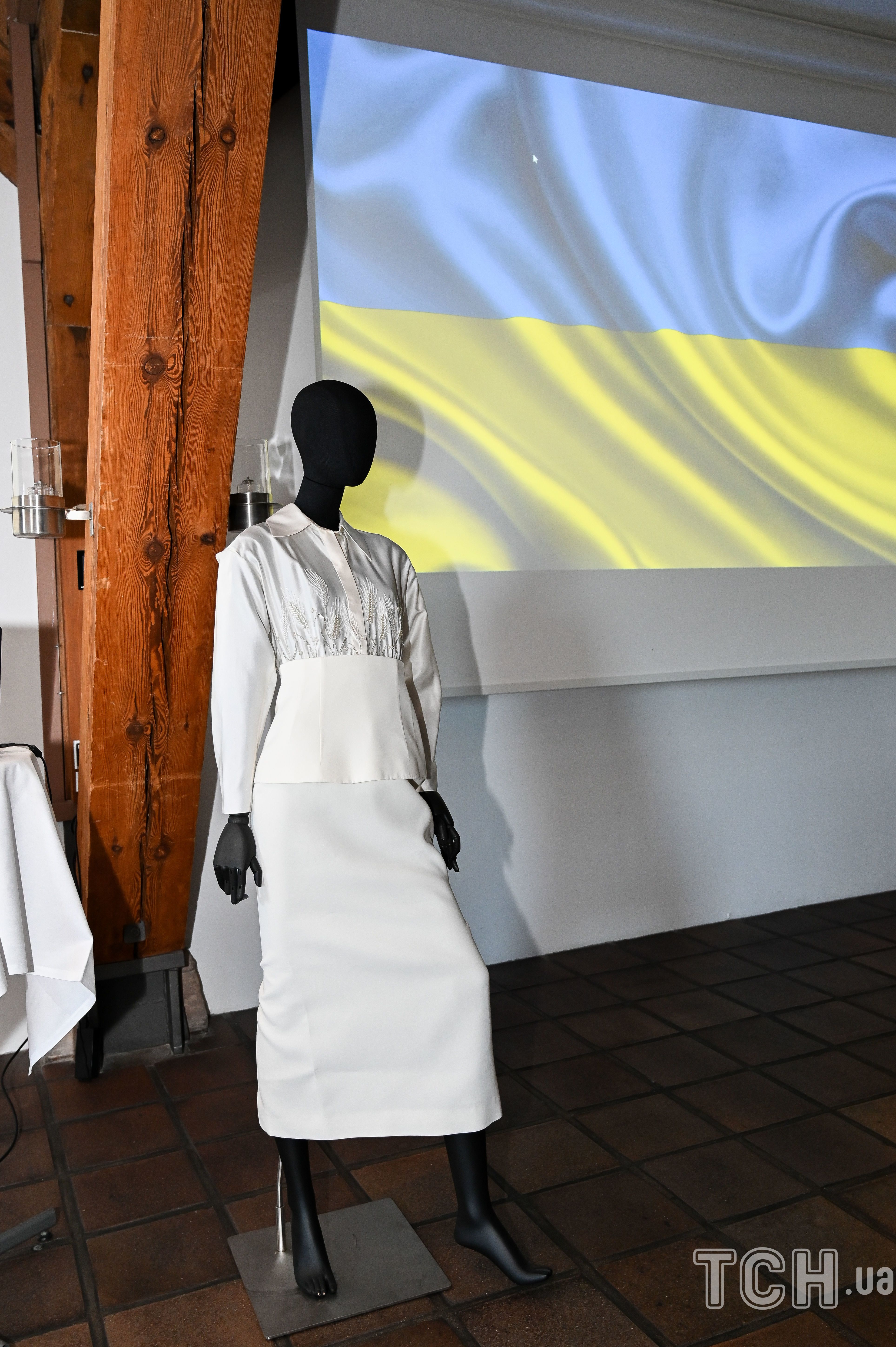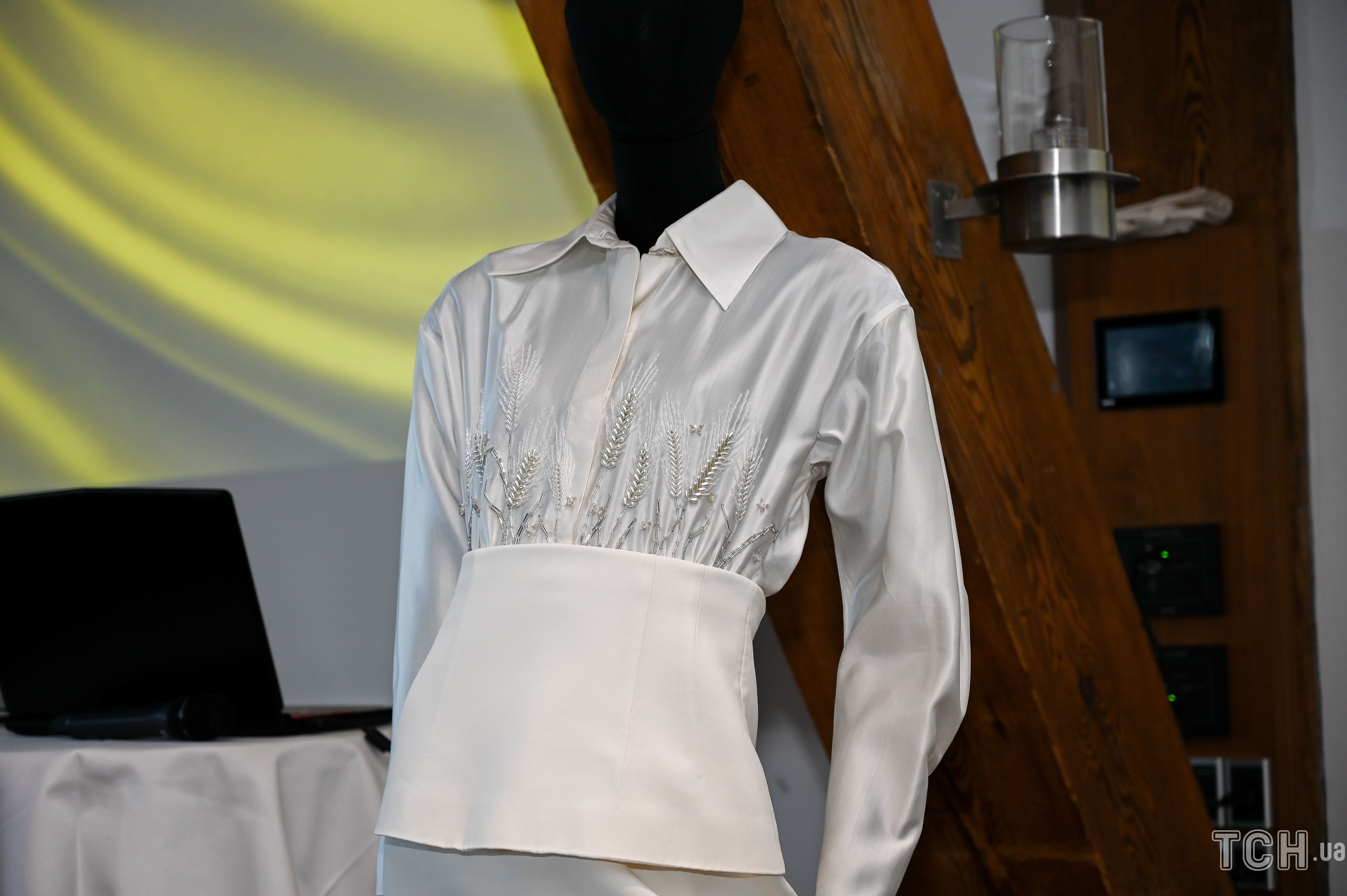 Белоснежный наряд создал украинский дизайнер Лилия Литковская, и он состоит из классической юбки-карандаша и блузы из дикого шелка, которую украшала нежная вышивка в виде колосьев пшеницы. Использовались в вышивке жемчуг и бисер.