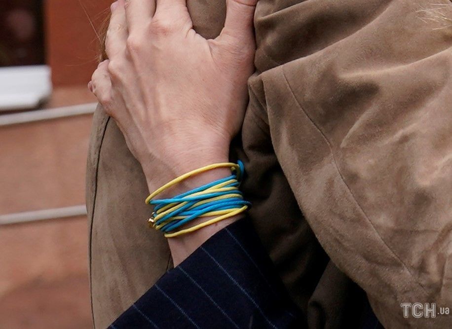 Также в образе Елены Зеленской присутствовала еще одна патриотичная деталь - сине-желтый браслет от Guzema Jewelry.