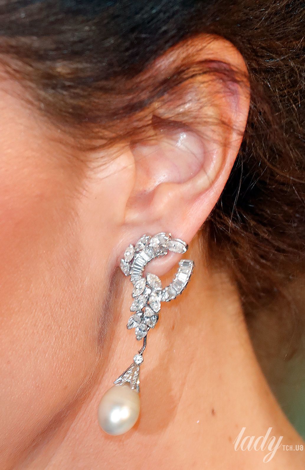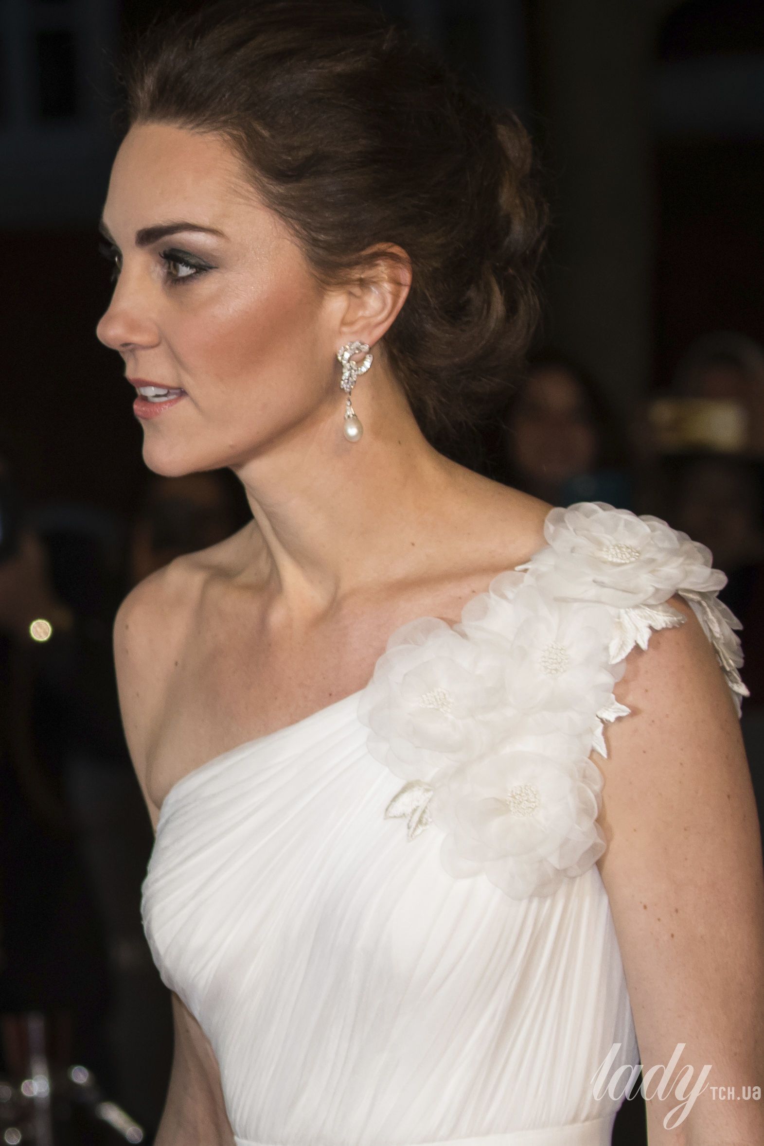 В этот раз для появления на публике 37-летняя герцогиня Кембриджская выбрала белоснежное платье с обнаженным плечом от Alexander McQueen. К нему были подобраны туфли Jimmy Choo со стразами, маленький белый клатч от Alexander McQueen, бриллиантовый браслет королевы Елизаветы II и серьги из личной шкатулки принцессы Дианы.