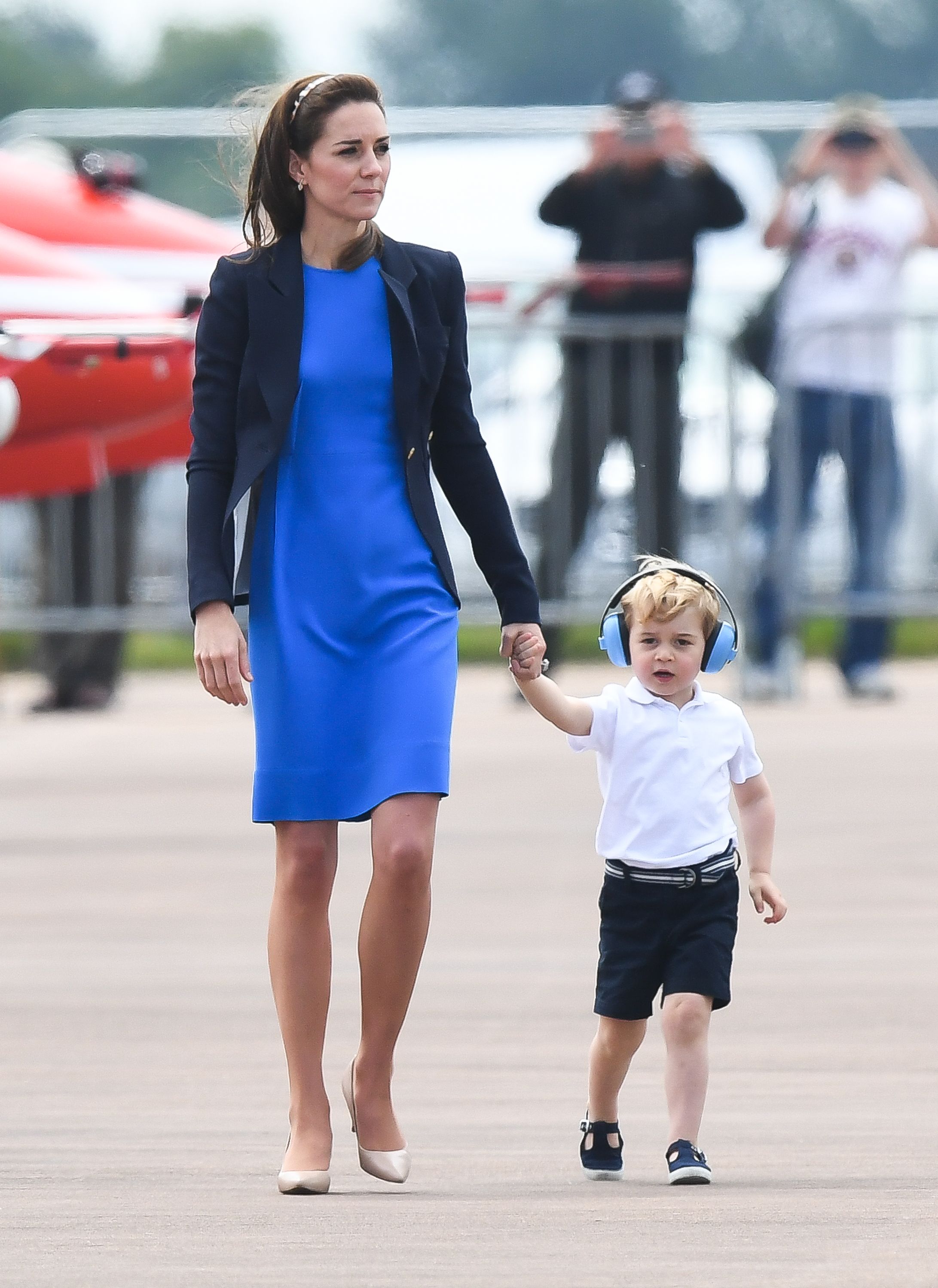Для очередного своего выхода Кэтрин выбрала скромный наряд – брюки марки Gap за 21,99 фунтов, синий блейзер от Smythe за 462 фунта, в котором ранее уже появлялась на публике вместе с сыном принцем Джорджем на британском авиашоу Royal International Air Tattoo. А также обула любимые бежевые туфли на платформе, которые надевала вчера.