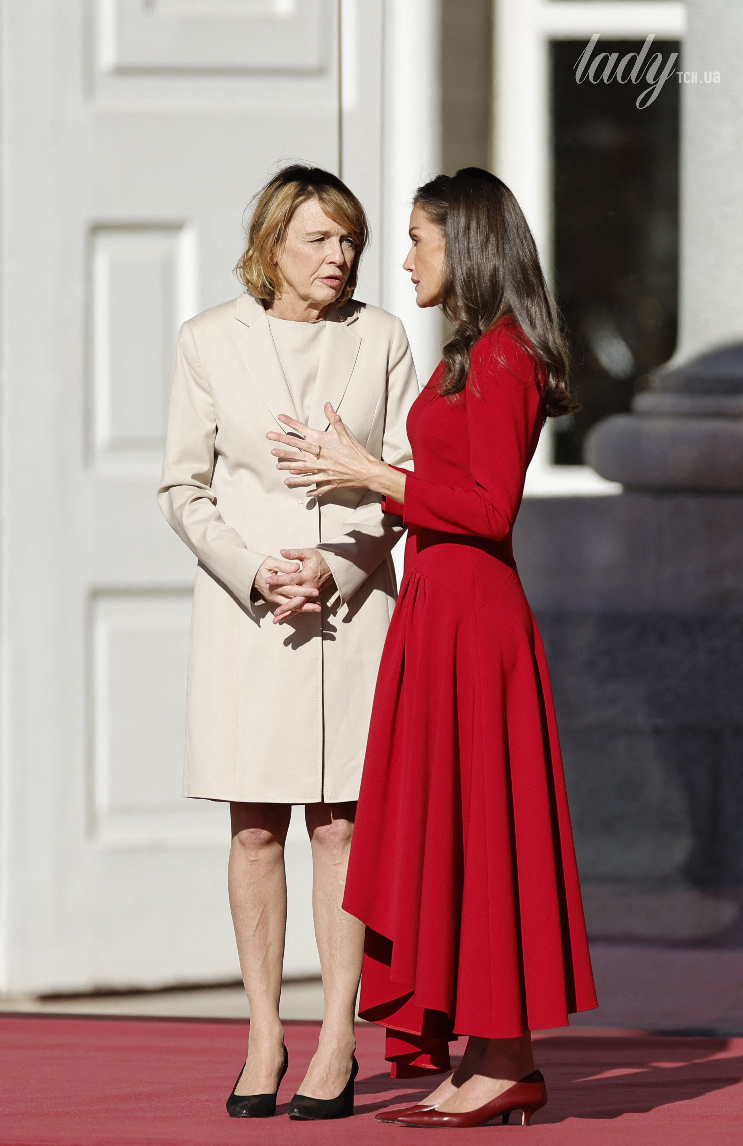 Королева облачилась в красное ассиметричное платье миди от The 2nd Skin Co, стоимостью 1200 евро, а поверх него набросила свое любимое черное пальто от Carolina Herrera. В качестве обуви Летиция подобрала темно-красные кожаные туфли на каблуках от Magrit — одном из ее самых любимых обувных брендов.