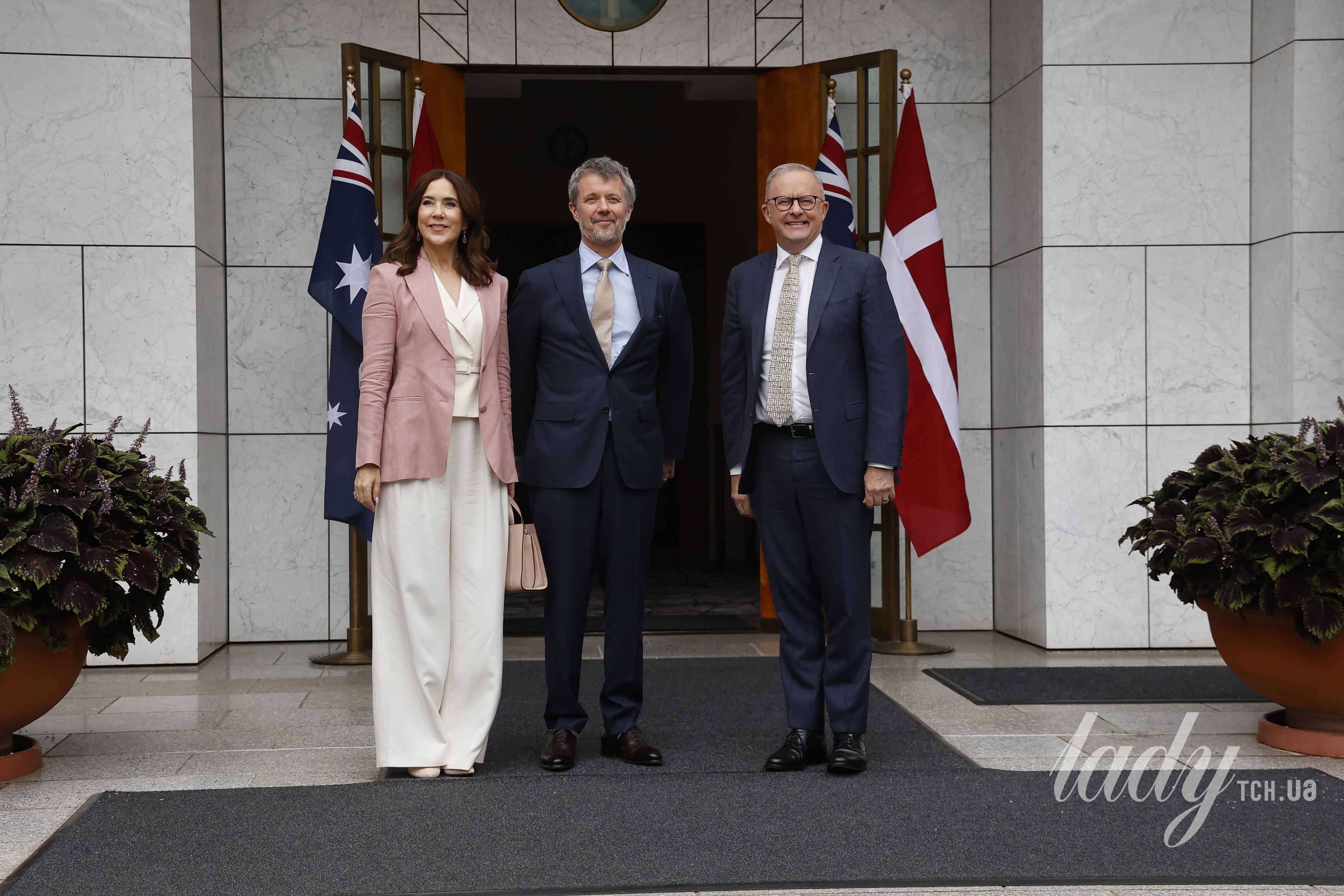 После этого они встретились с премьер-министром Австралии Антони Албанезе и членами Парламентской группы дружбы между Данией и Австралией. Королева была в молочном брючном костюме, а сверху надела пудровый жакет, подобрала к образу светлые туфли-лодочки и сумку в тон. Она также надела серьги-висюльки в виде капель и кольцо с камнем.