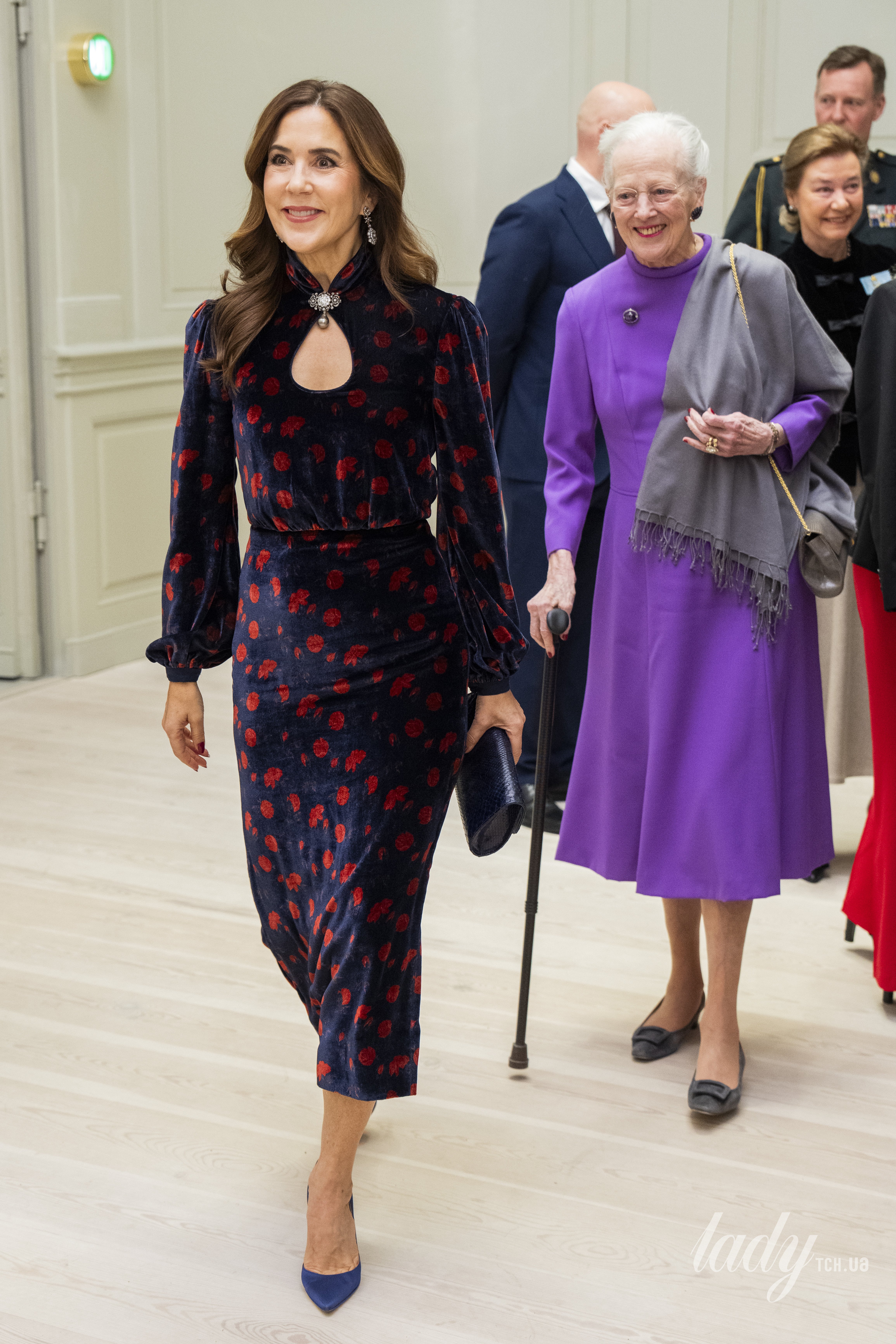 Супруга короля Фредерика X — Мэри — появилась на мероприятии в платье-миди от Saloni Official с небольшим овальным вырезом на декольте и брошью с жемчужиной на воротнике. К красивому наряду королева подобрала туфли Gianvito Rossi из темно-синего шелка на каблуках, синий крокодиловый клатч Konvo и серьги-висюльки, которые отлично гармонировали с брошью. Мэри сделала укладку волнами, легкий макияж глаз и подчеркнула губы помадой.