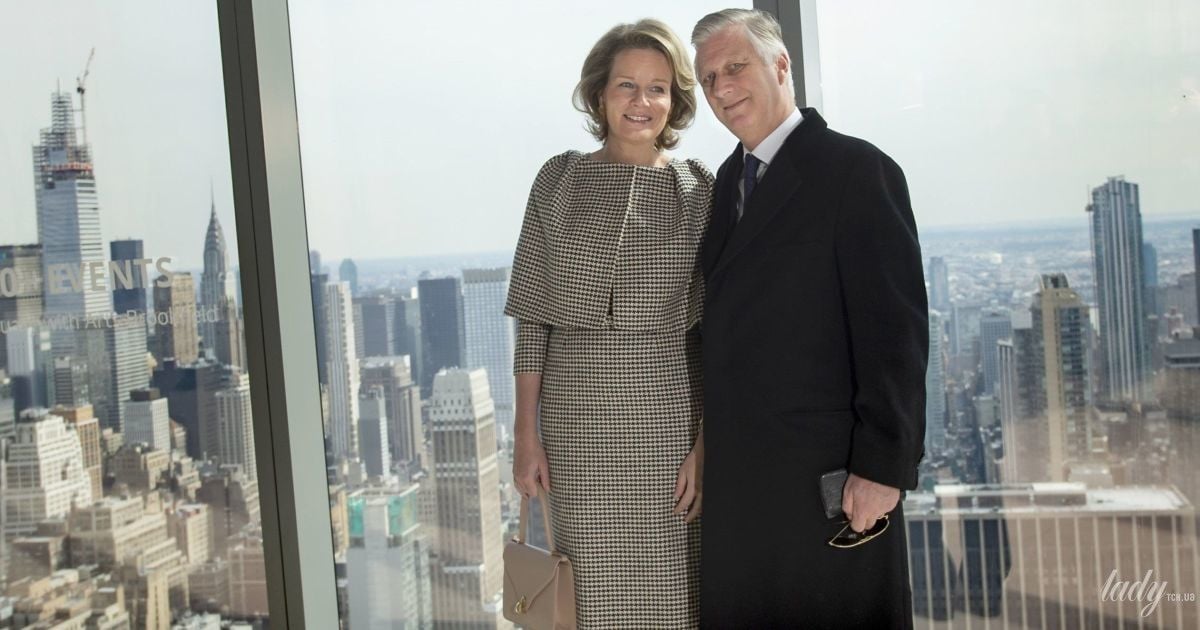 47-летняя королева Матильда приехала на эту встречу в лаконичном платье длины миди с принтом "гусиная лапка" с кейп-накидкой сверху. Ее аутфит дополняли бежевые замшевые туфли-лодочки и бежевая небольшая сумка на коротком ремешке. Также Матильда сделала простую и традиционную укладку и легкий дневной макияж и надела золотые серьги-лепестки.