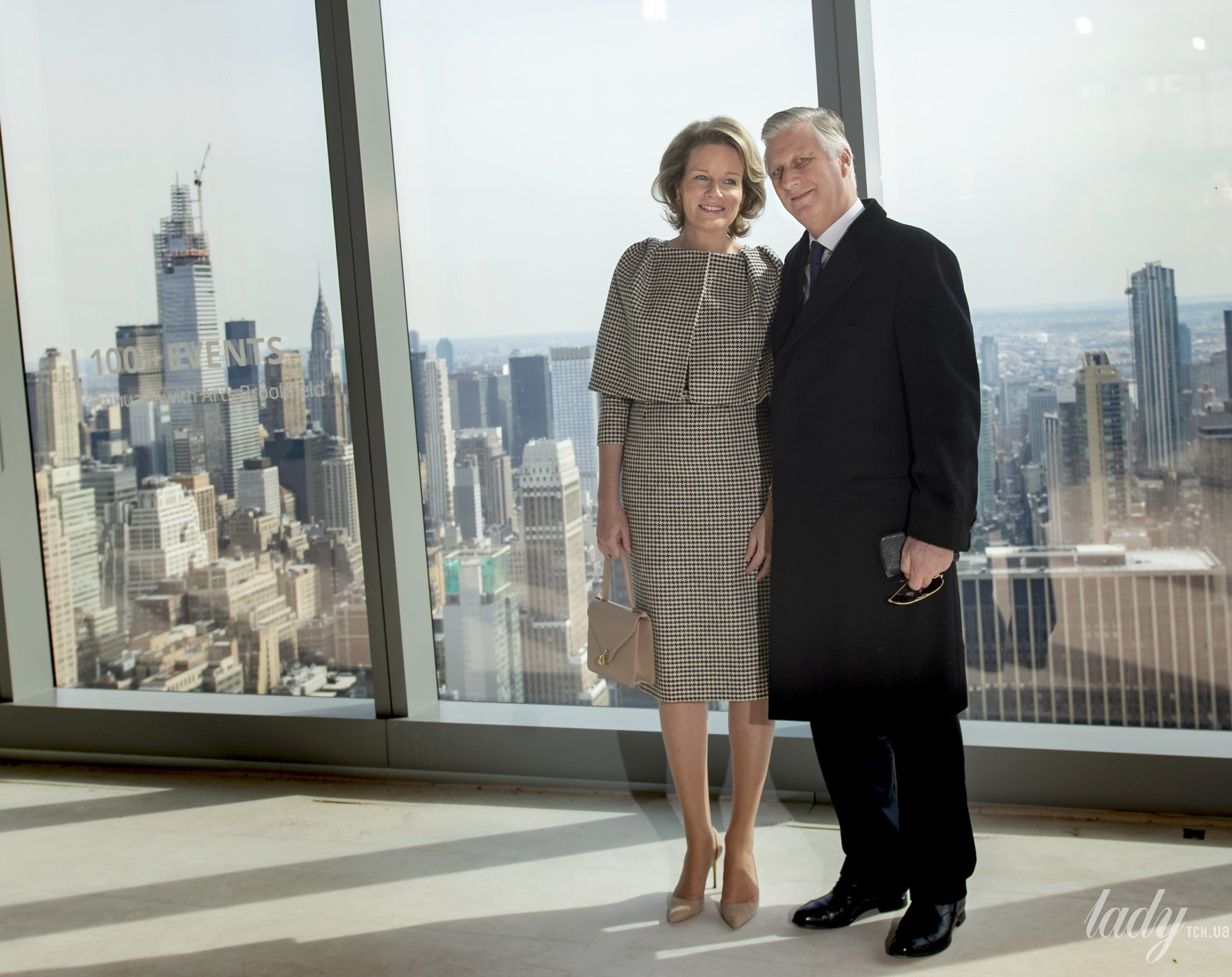 Ее супруг король Филипп был одет в черный классический костюм, белую рубашку, галстук и длинное черное пальто. Они были запечатлены на фоне небоскребов, Филипп слегка приобнял свою жену.