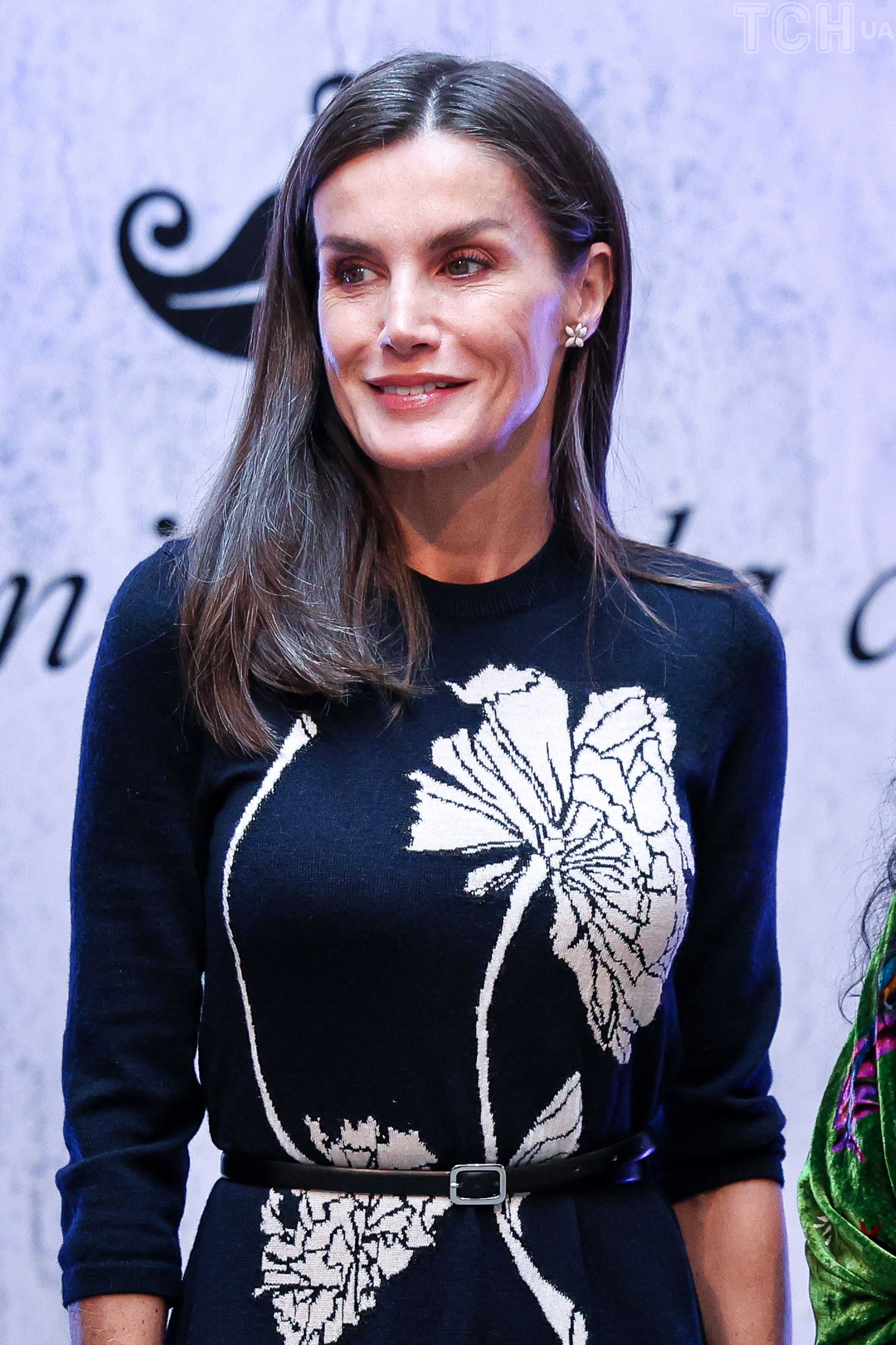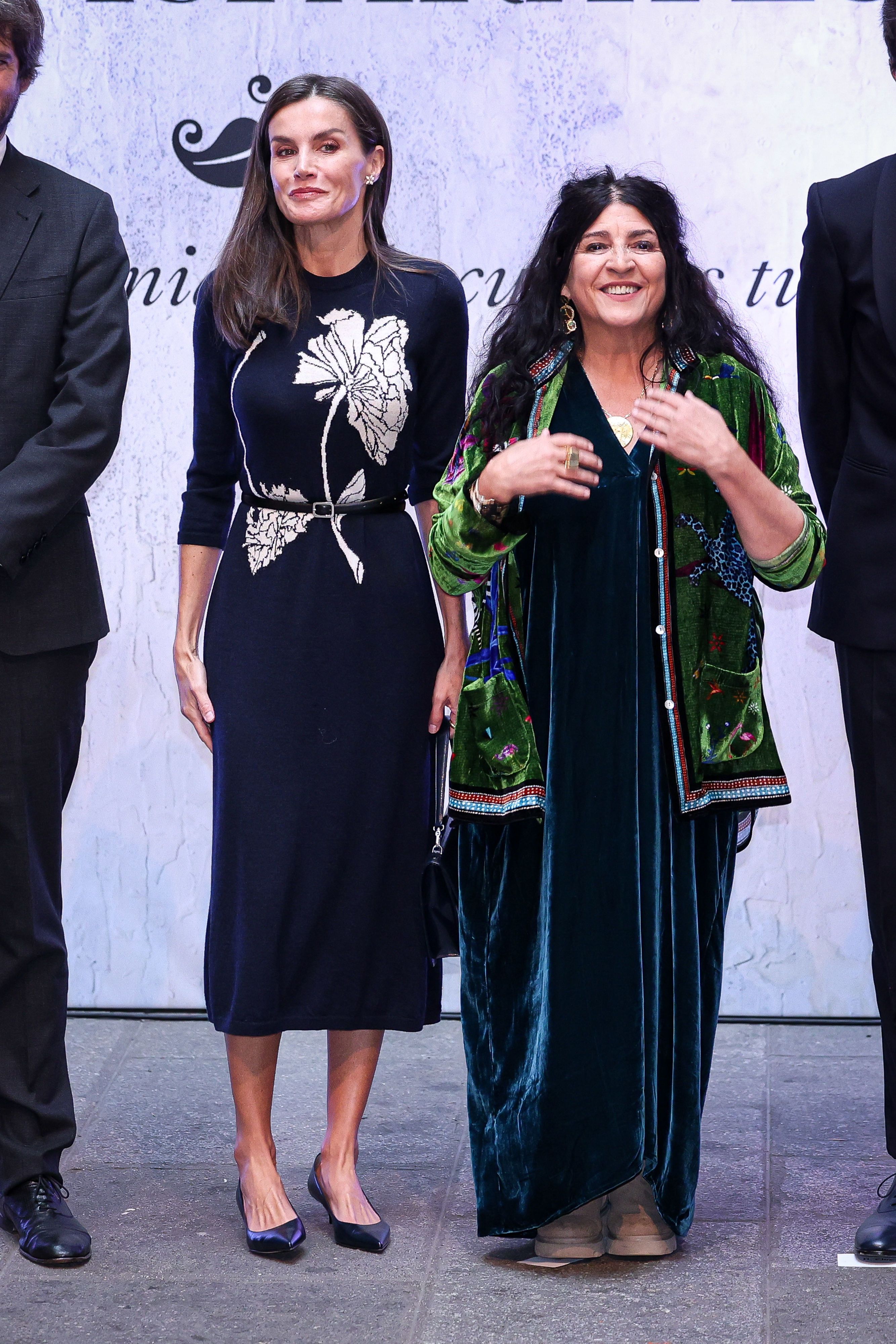 Летиция открыла в Королевской академии изящных искусств Сан-Фернандо выставку на которую приехала в темно-синем платье-миди с большими белыми цветами от испанского бренда Galcon Studio, выполненное из высококачественной мериносовой шерсти. Платье выделяется овальным вырезом и рукавами три четверти, а также дополнено тонким поясом на талии. Этот наряд королева уже неоднократно носила.