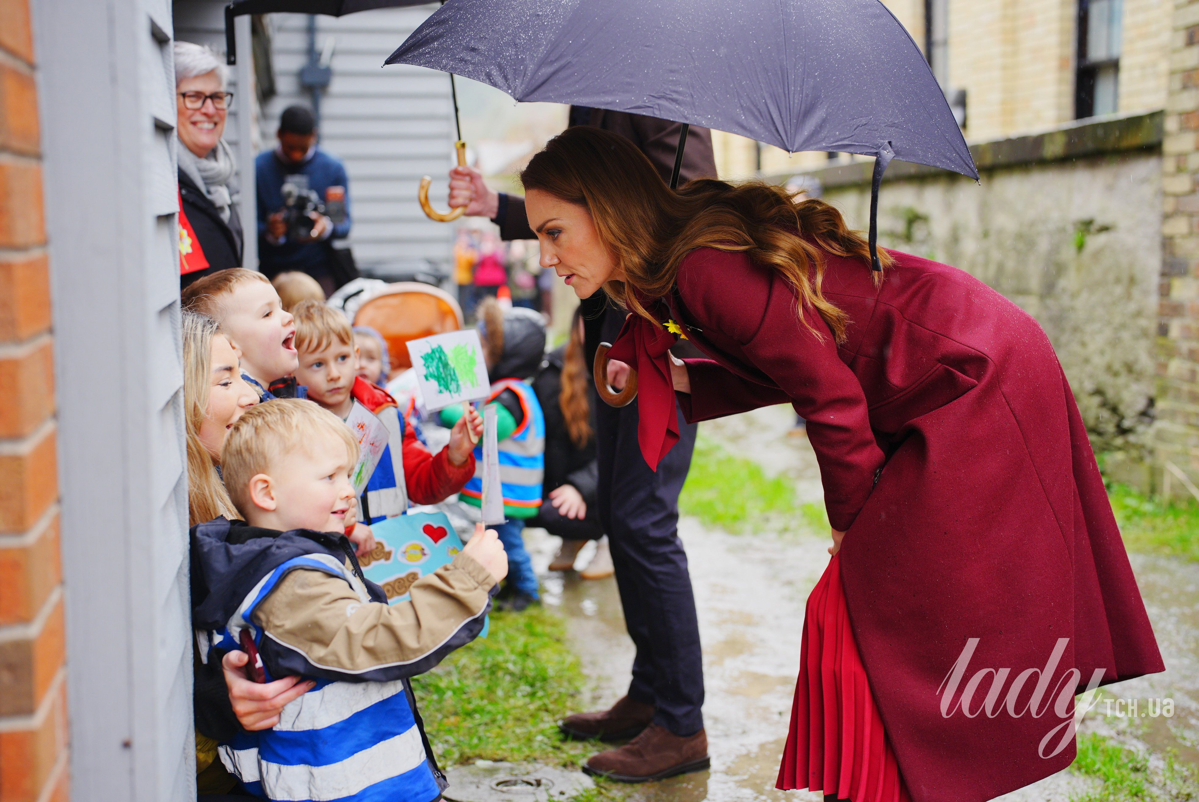 Супруги также встретились с людьми, которые собрались на улице, несмотря на дождливую погоду. Кэтрин держала в руках зонтик, но все равно принимала цветы и жала руки.
