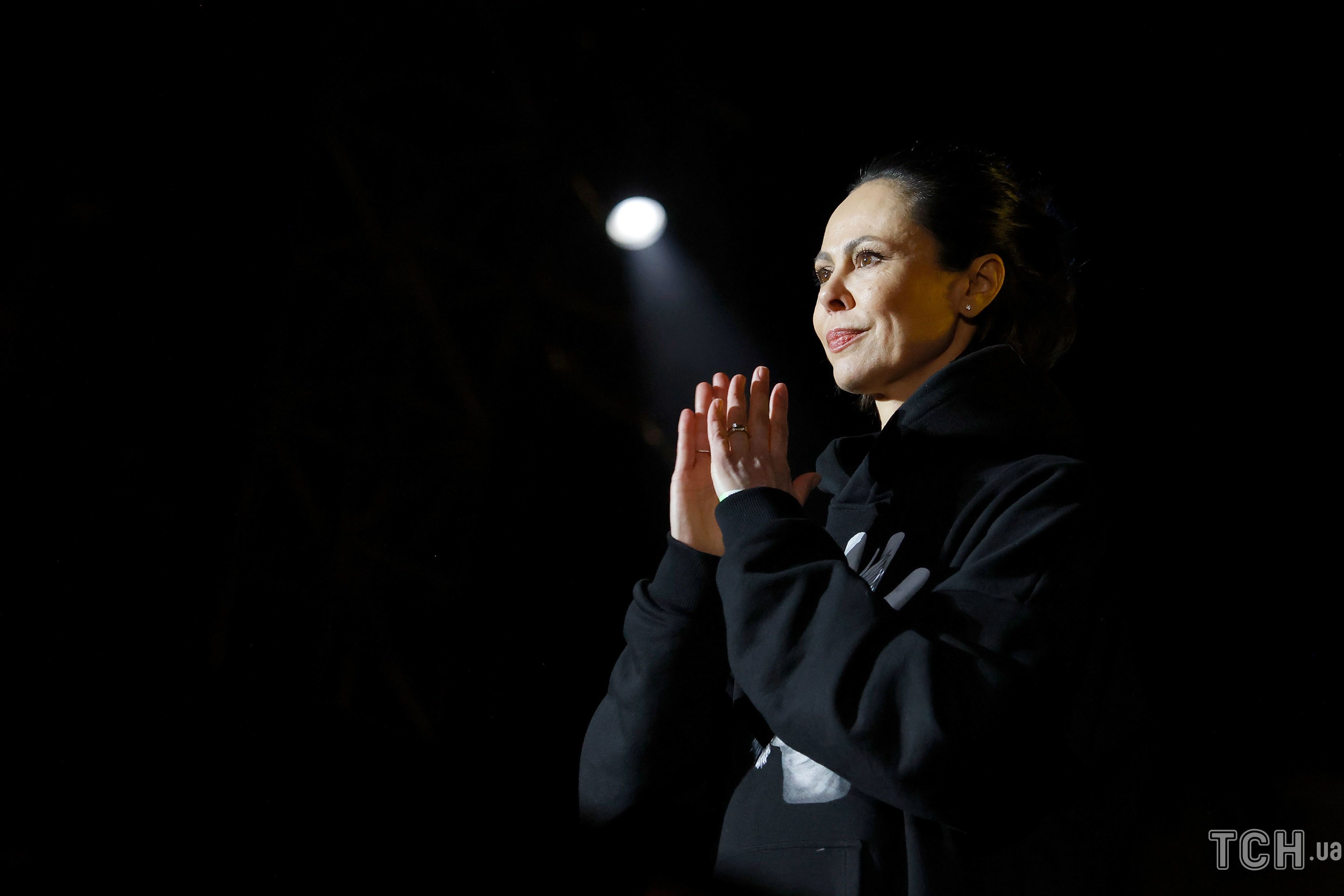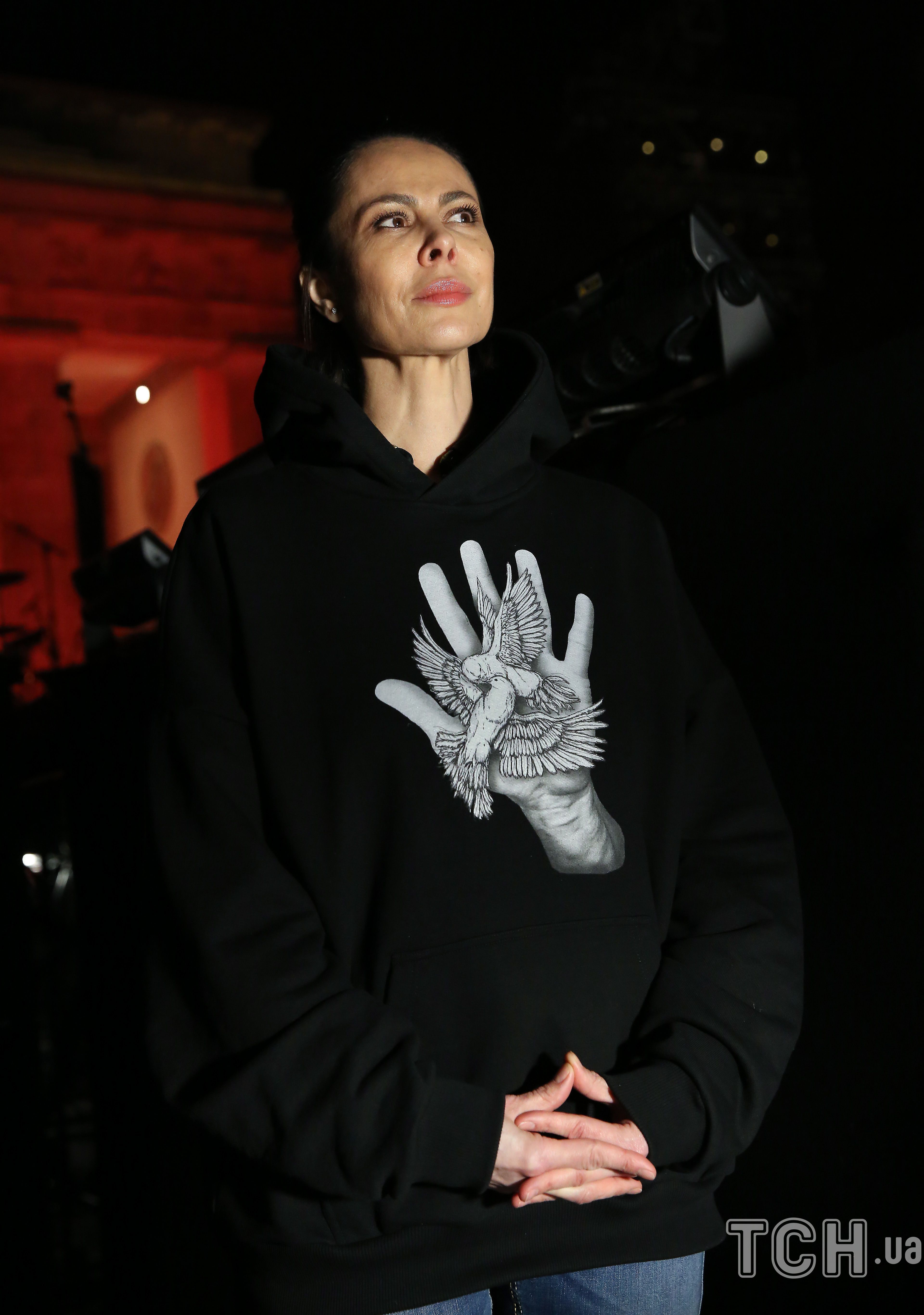 Наталья одета в черный свитшот с изображением руки своего мужа, в руке изображены две птицы, прислонившие клювы к друг другу. Мероприятие под названием "Звуки мира" было организовано с целью потребовать прекращение войны в Украине.