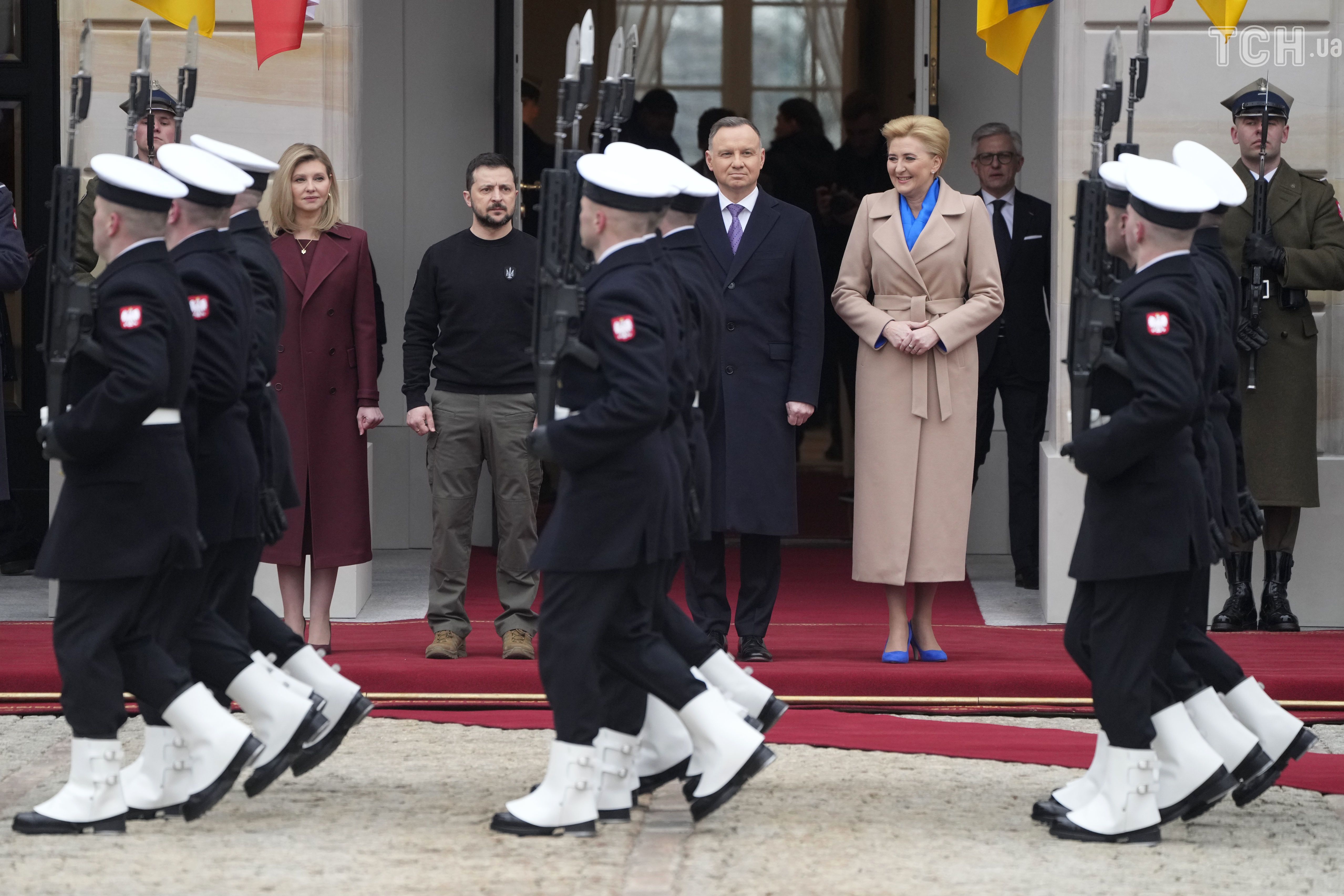 Президент Украины Владимир Зеленский и его супруга Елена Зеленская с официальным визитом прибыли в Польшу. У президентского дворца в Варшаве их встретили президент Польши Анджей Дуда с супругой Агатой Корнхаузер-Дудой.