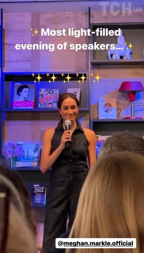 В черном комбинезоне и с золотым колье: Меган Маркл выступила на открытии книжного магазина