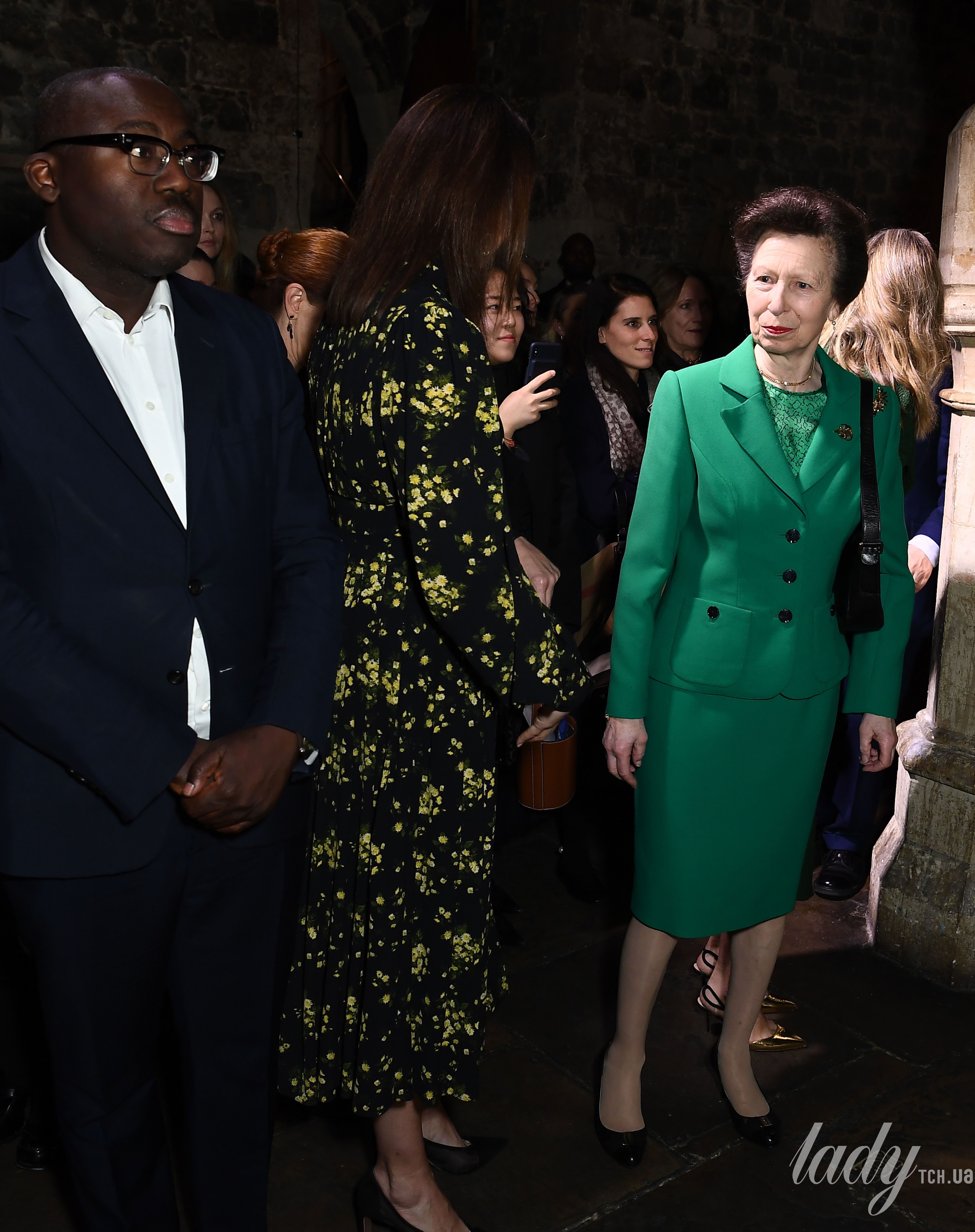 69-летняя принцесса Анна приехала на мероприятие в изумрудном костюме, под которым была блузка в тон. К луку принцесса подобрала черные кожаные туфли на каблуках и сумку. Надела несколько золотых брошек и широкую золотую цепочку на шею, а также серьги-висюльки. Принцесса сделала свою любимую прическу, а на губы нанесла яркого оттенка помаду.