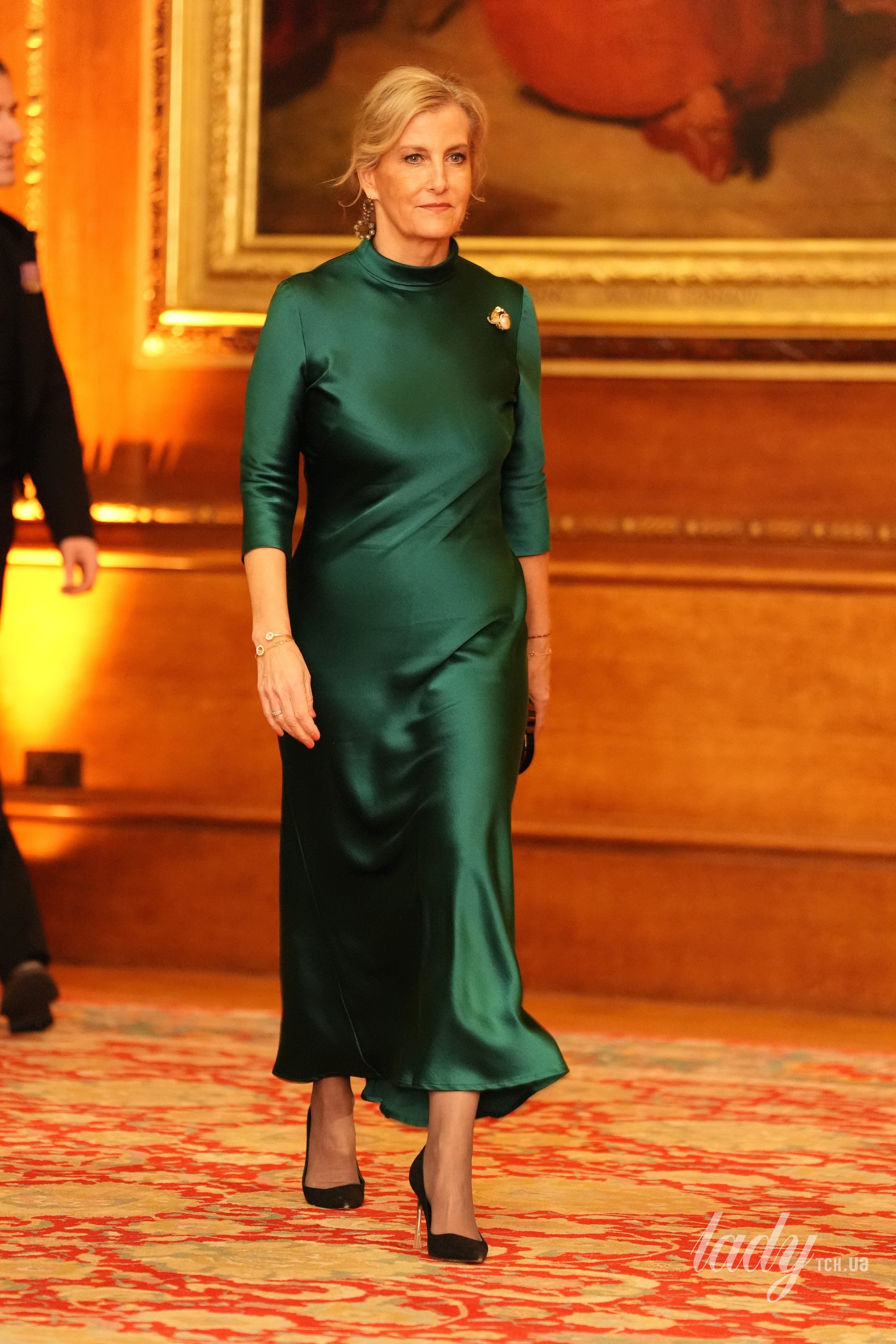 61-летняя герцогиня Эдинбургская приехала на мероприятие в изумрудном макси-платье от Galvan London с драпировкой на талии и невысоким воротом, обула туфли на каблуках от Dior из черной замши и дополнила аутфит браслетом Happy Diamonds из розового золота и бриллиантов от Chopard.