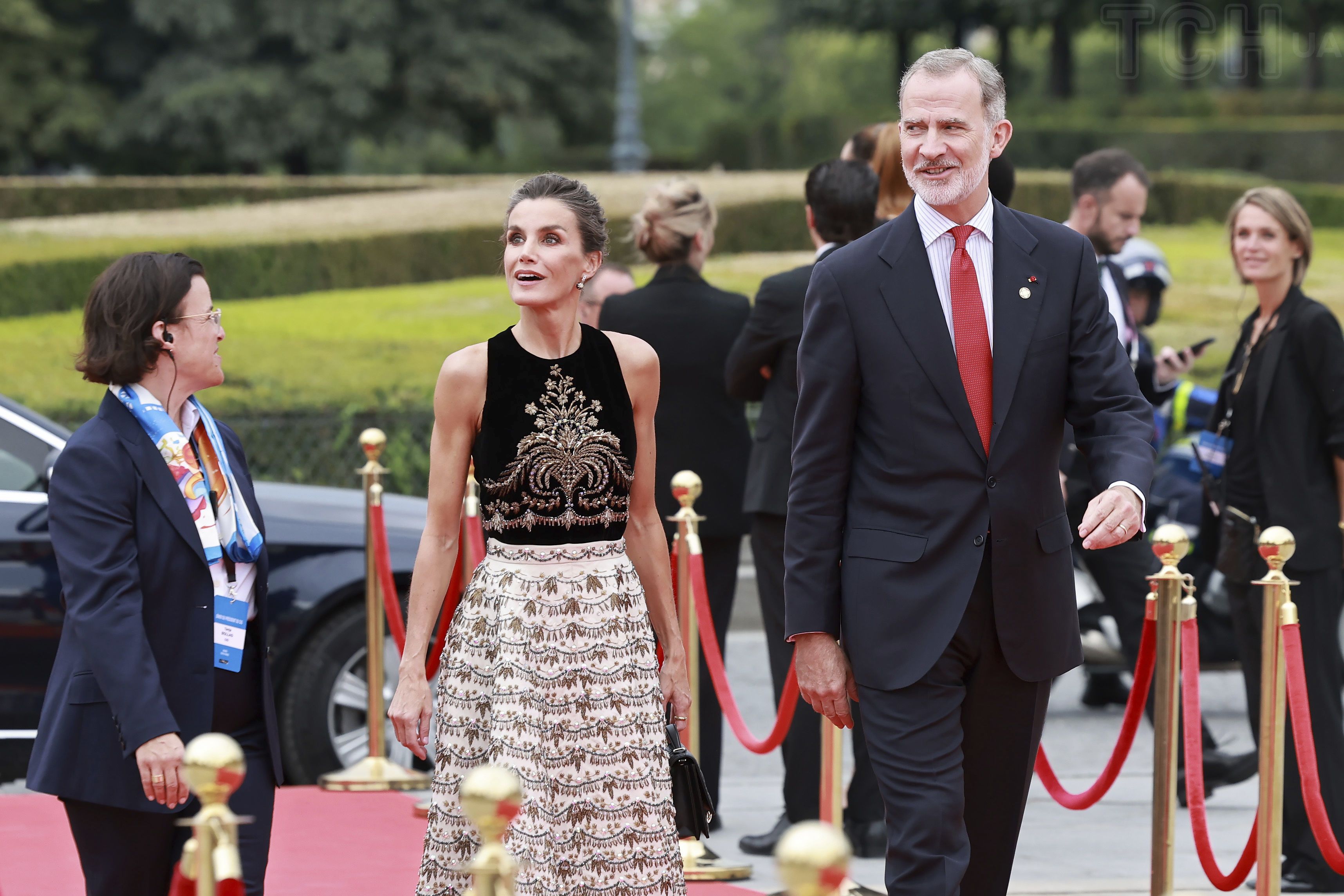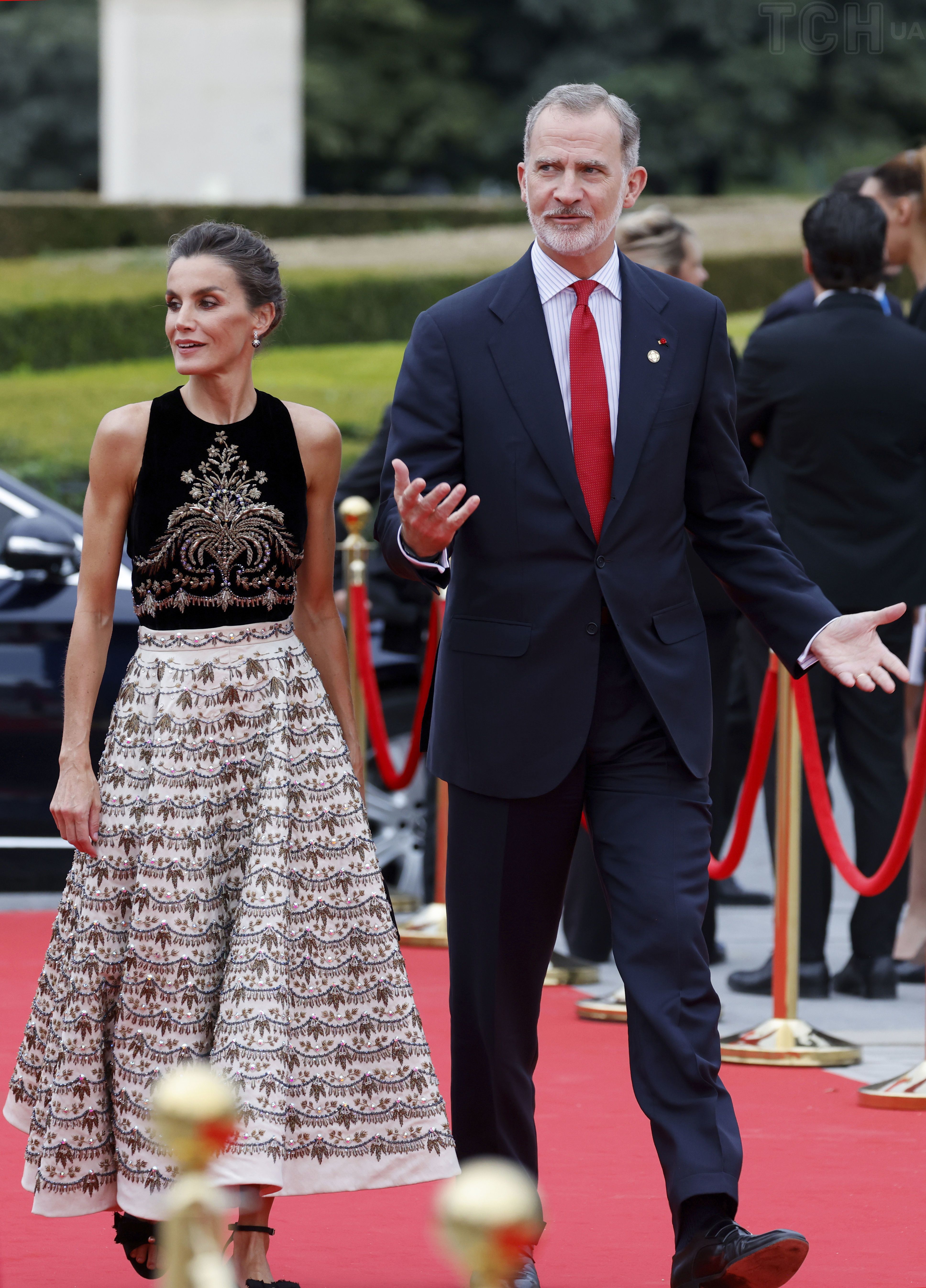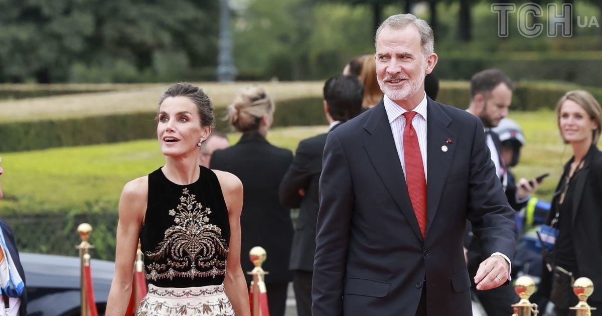 Летиция собрала волосы в прическу, сделала выразительный макияж, надела серьги-висюльки и свое любимое золотое кольцо Coreterno. Ее супруг король Филипп VI надел черный классический костюм, полосатую рубашку и красный галстук.