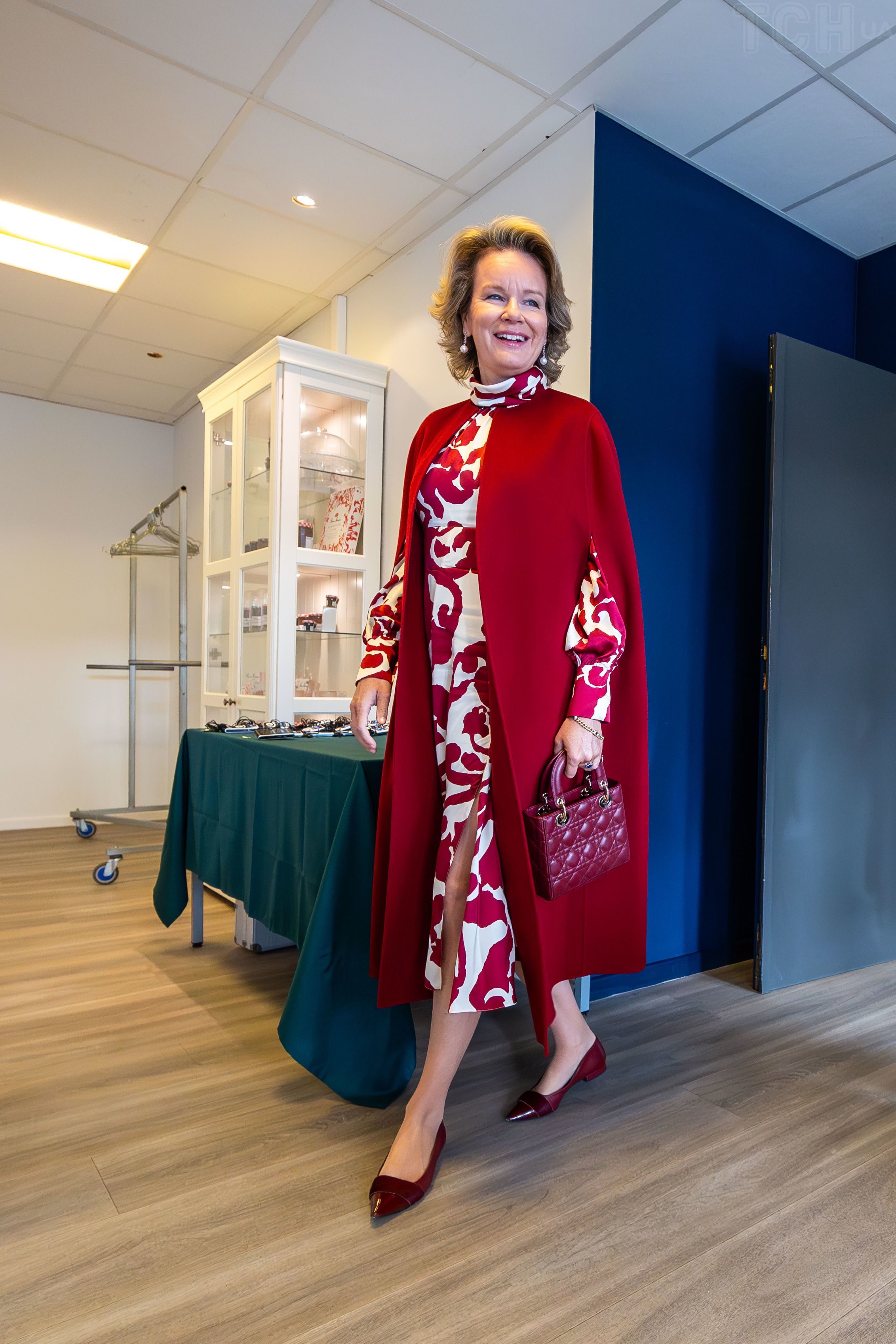 Королева Матильда приехала на мероприятие в светлом платье-рубашке с крупным цветочным принтом, молочную маленькую сумку держала в руках и была обута в светлые туфли из замши на каблуках. Образ свой Матильда дополнила несколькими золотыми браслетами и часами на запястье, серьгами-висюльками с пластинами и помолвочным кольцом с сапфиром. Сделала укладку и легкий дневной макияж.