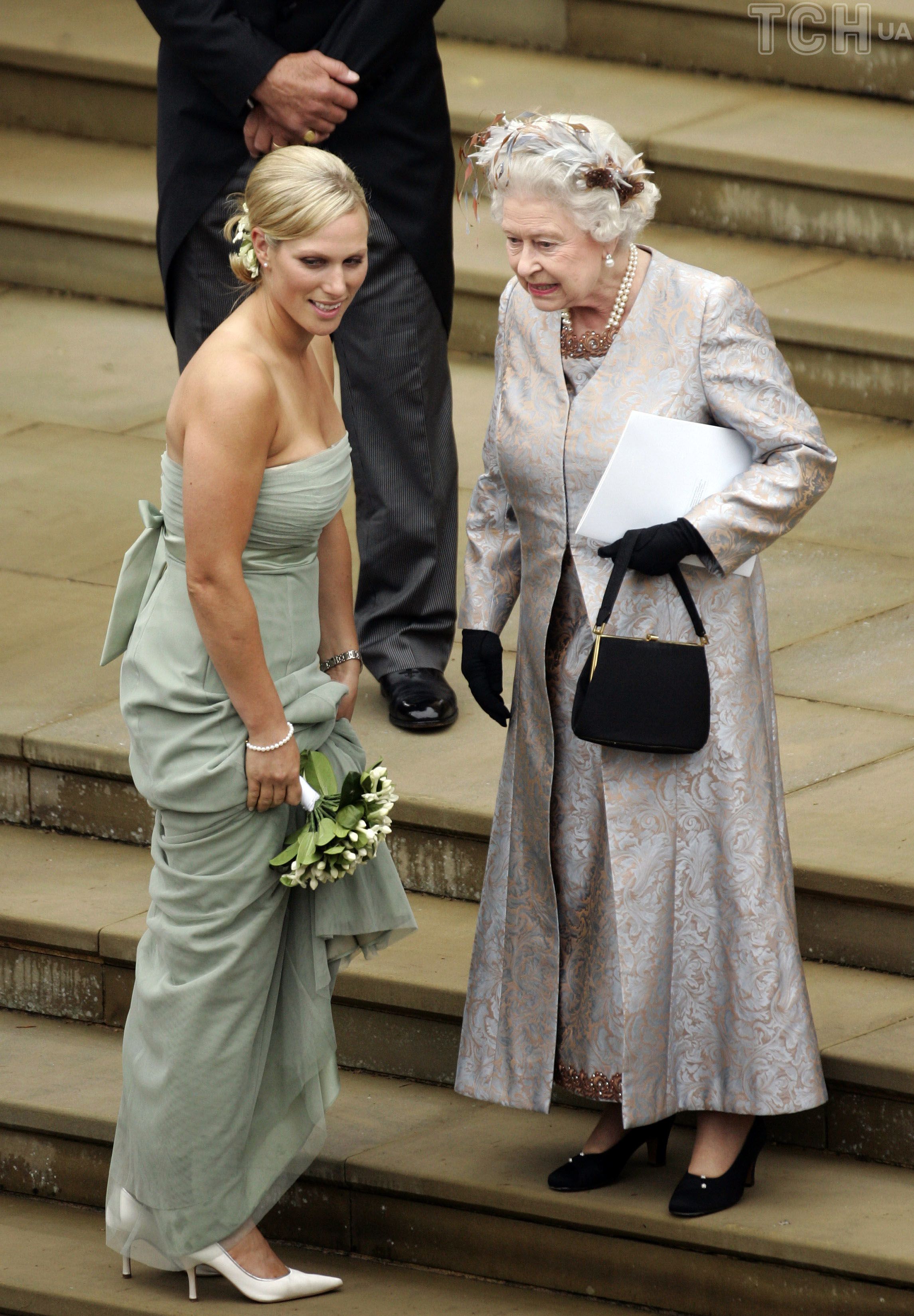На фото с королевой Елизаветой II запечатлена ее внучка Зара Филлипс - сестра жениха и дочь принцессы Анны. На ней было мятное платье без бретелек и с бантом на спине, белые туфли на каблуках, жемчужный браслет и жемчужные серьги. Также было видно следы от купальника на теле Зары.