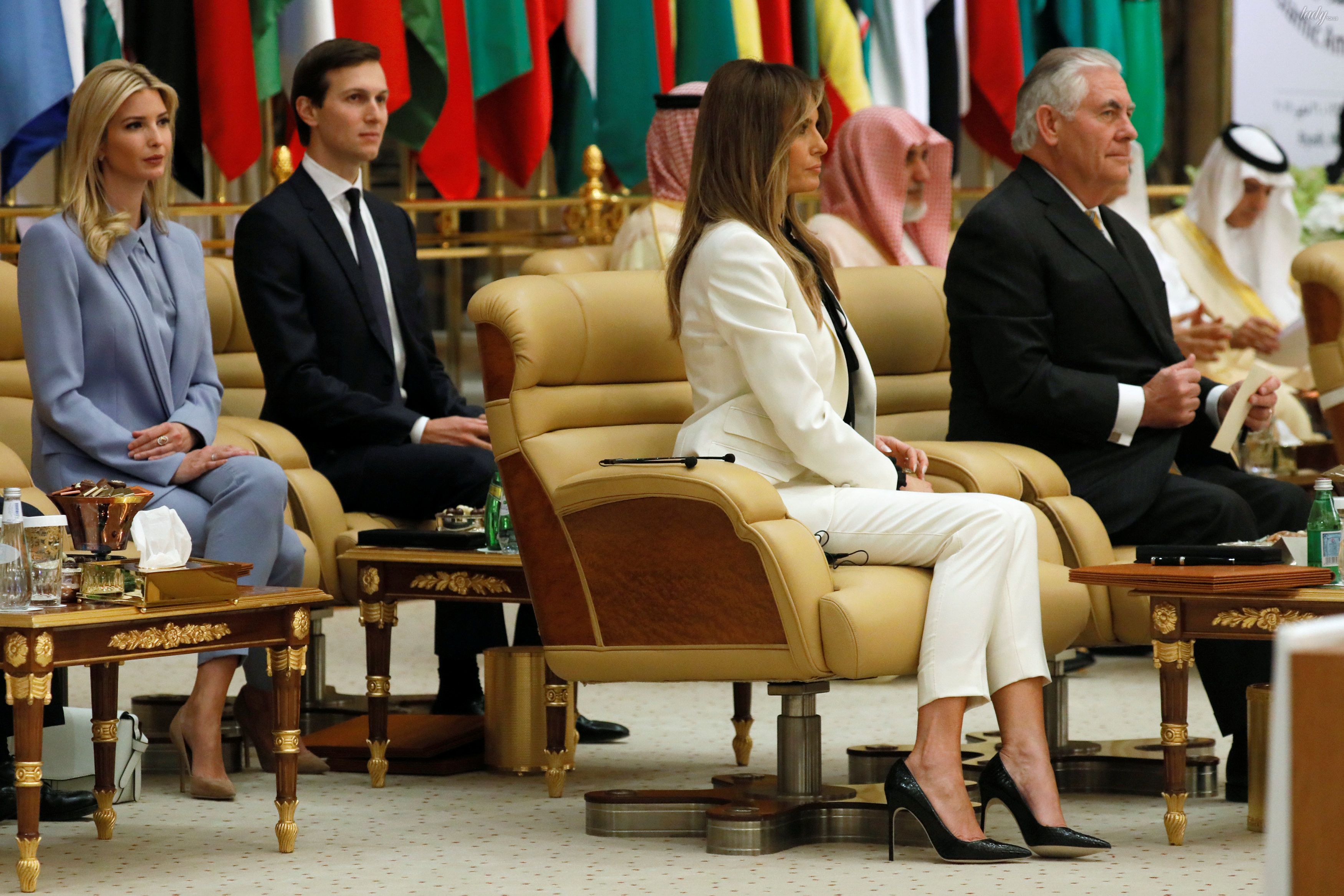 Первая леди выбрала для этого события строгий образ в классических цветах: белую блузку и черную юбку-карандаш.
