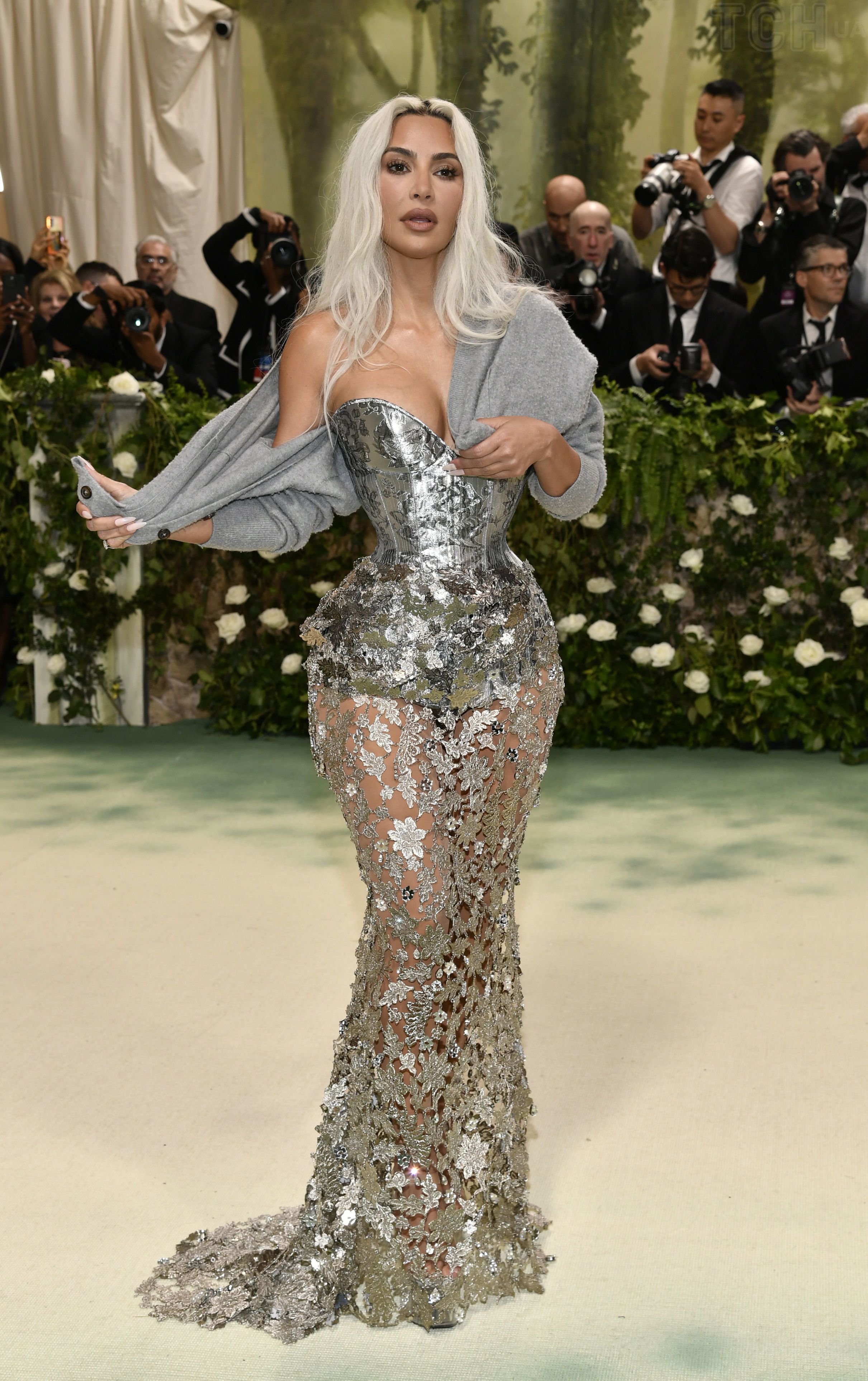 Это слишком красиво: Ким Кардашьян посетила Met Gala в серебряном платье-кольчуге и кардигане