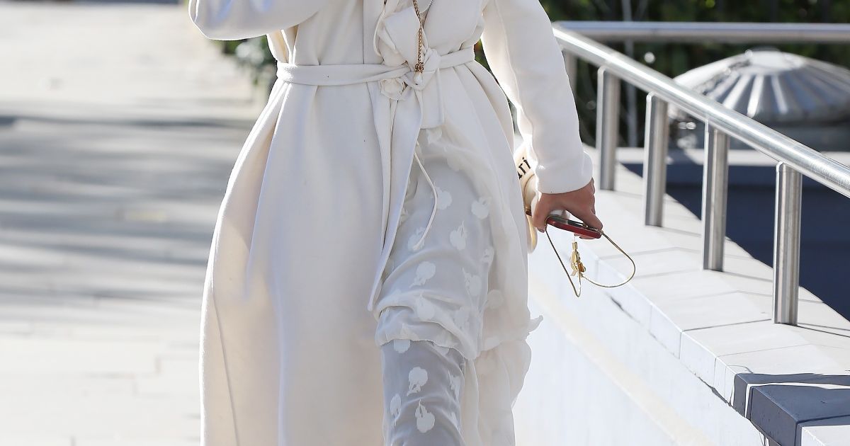 В этот раз Рита была одета во все белое: в полупрозрачное платье и белоснежное пальто. Она сочетала наряд с ботильонами на шнуровке и многочисленными аксессуарами.