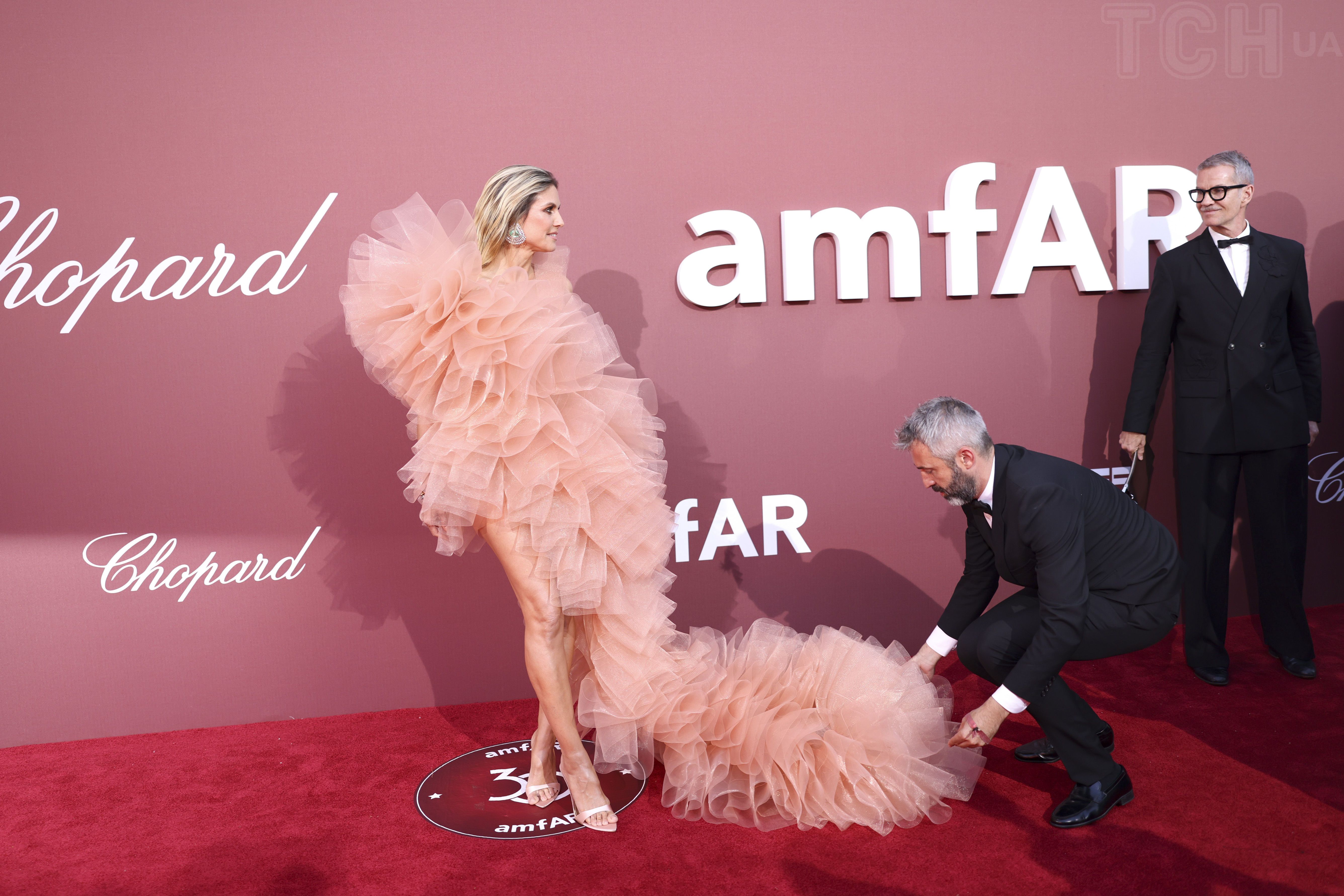 Супермодель и судья America's Got Talent выглядела невероятно. Она была одета в пышное ассиметричное платье персикового оттенка с воланами из коллекции SS24 "Скорость эмоций" бренда Lever Couture. Наряд обнажал одну ногу Хайди и имел шлейф, который ей помогали укладывать на полу, чтобы сделать красивые фотографии. Обута она была в светлые атласные босоножки.