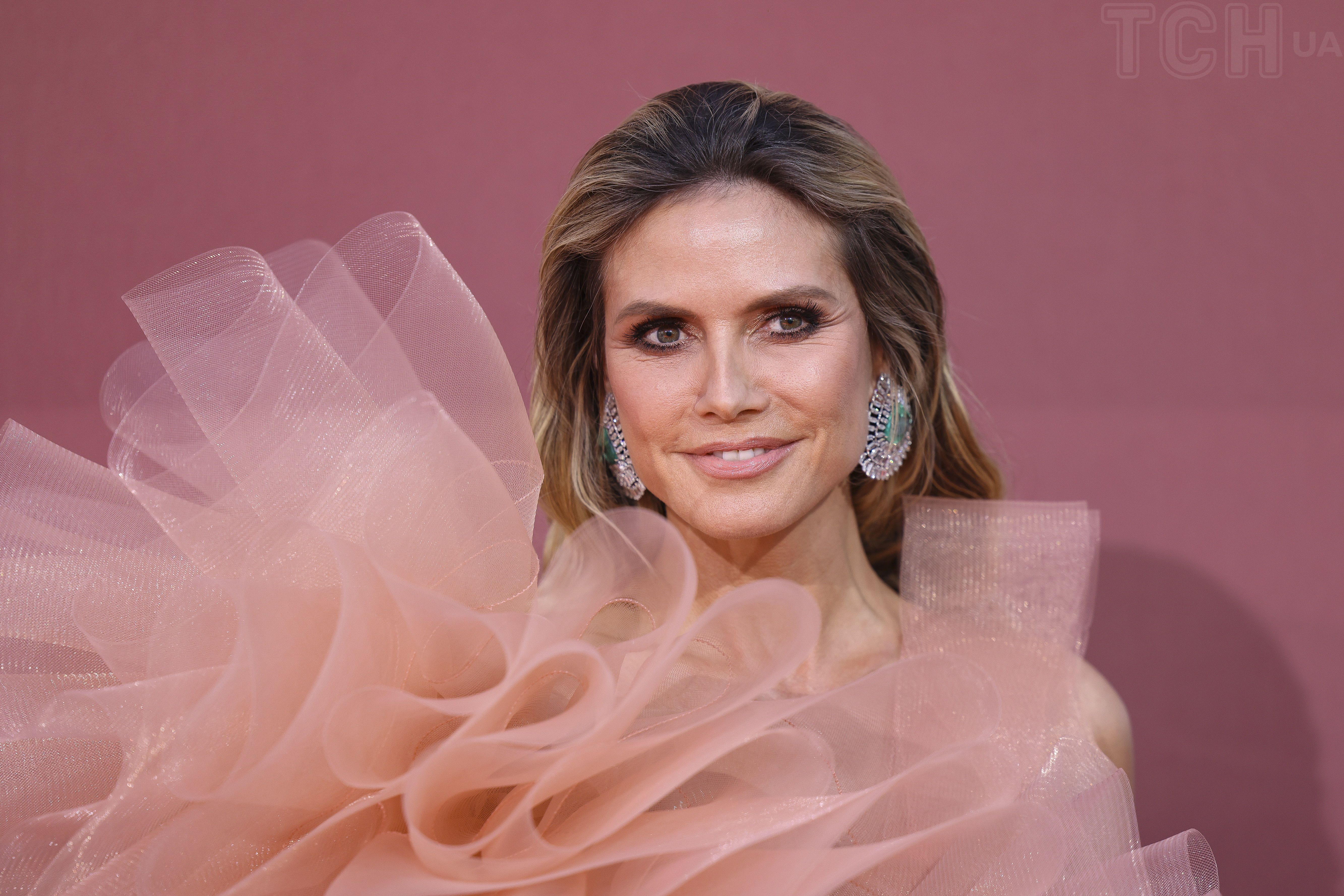 Какая красивая: Хайди Клум в персиковом платье с воланами позировала на гала-вечере