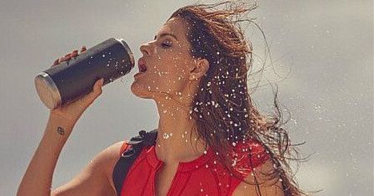 Пока в Сети доступны лишь две фотографии с этой фотосъемки, но зато какие! На них Фонтана запечатлена в красном слитном купальнике на молнии посередине, у нее в руке термос с прохладным напитком, которым модель обливает себе лицо.