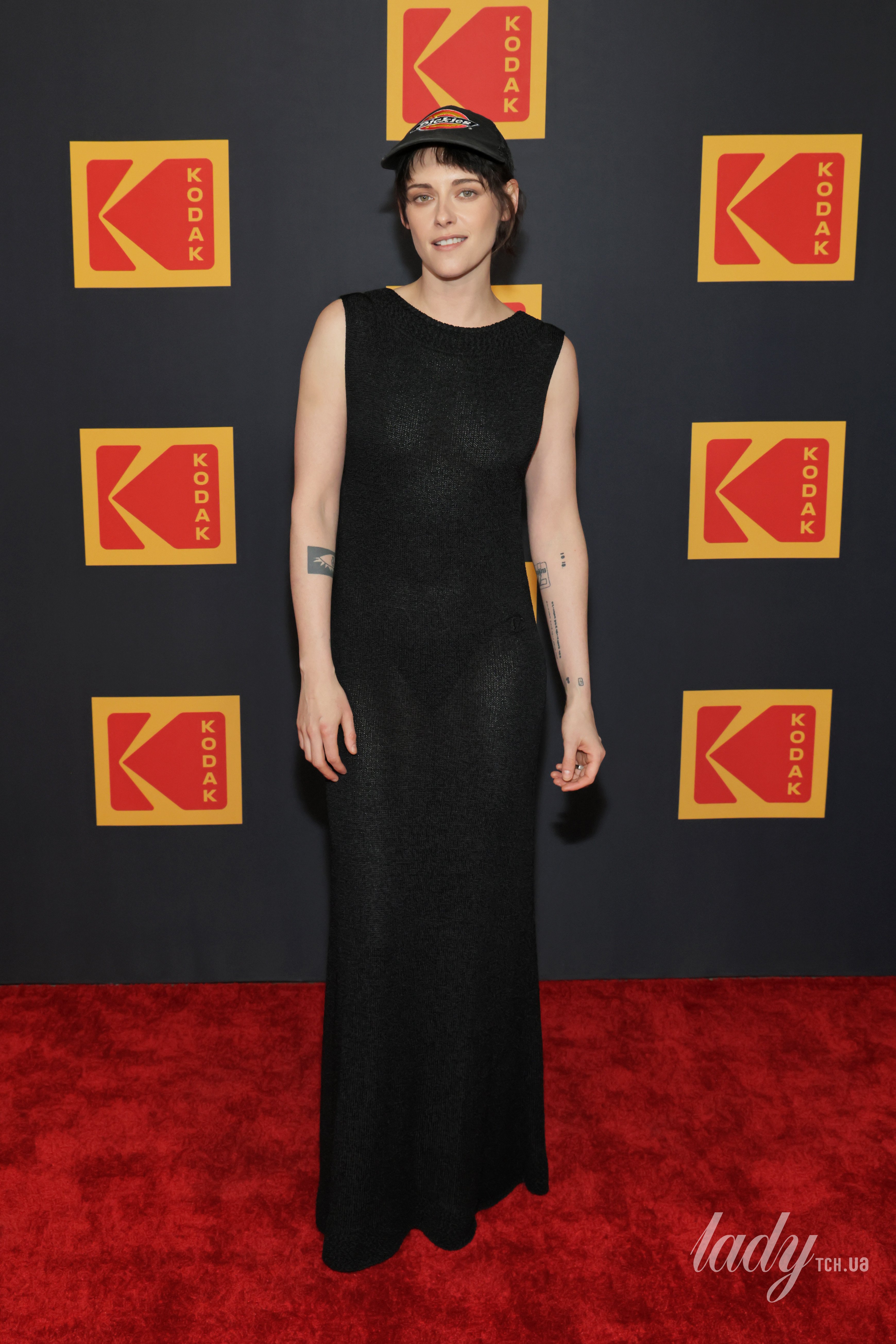 Наряд Кристен был немного прозрачным и не имел рукавов, также на горловине и подоле его украшал немного другой узор. Актриса собрала волосы и удивила тем, что дополнила образ кепкой.