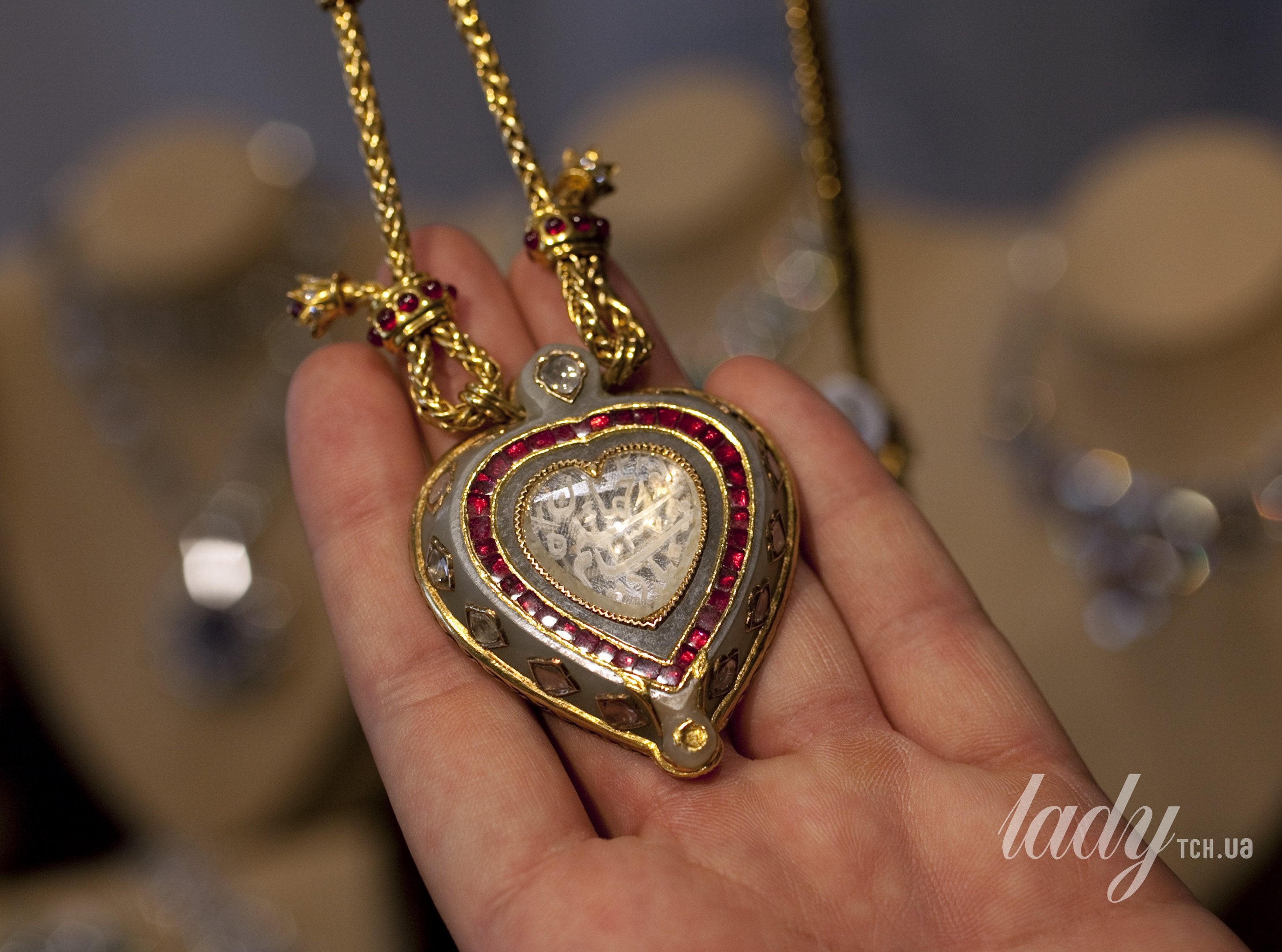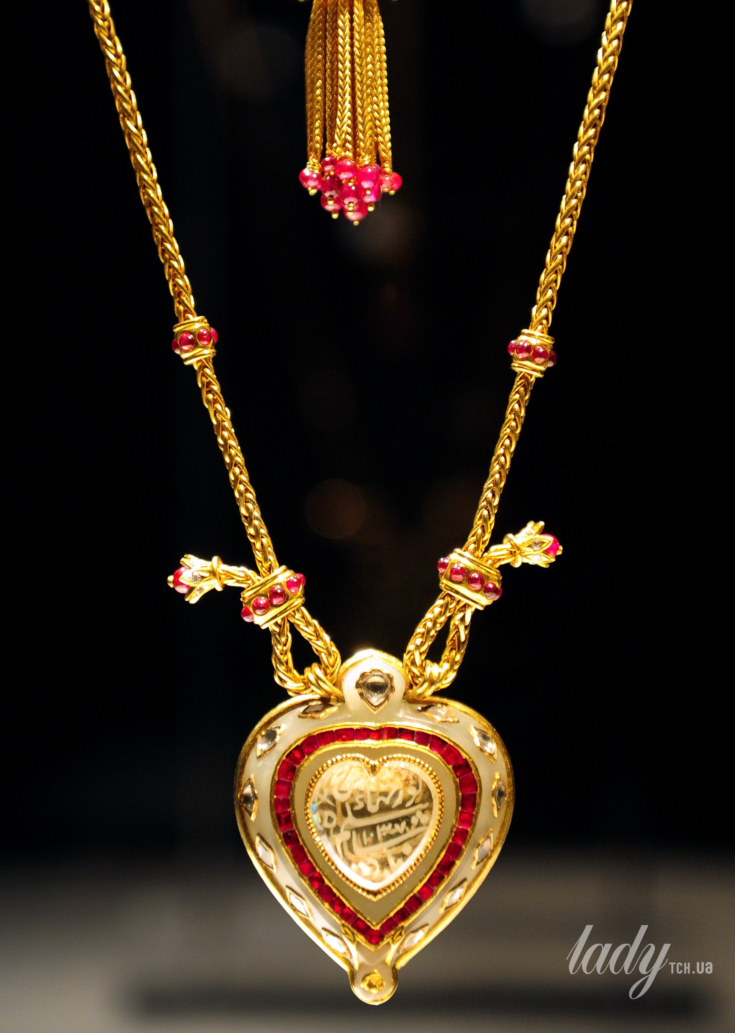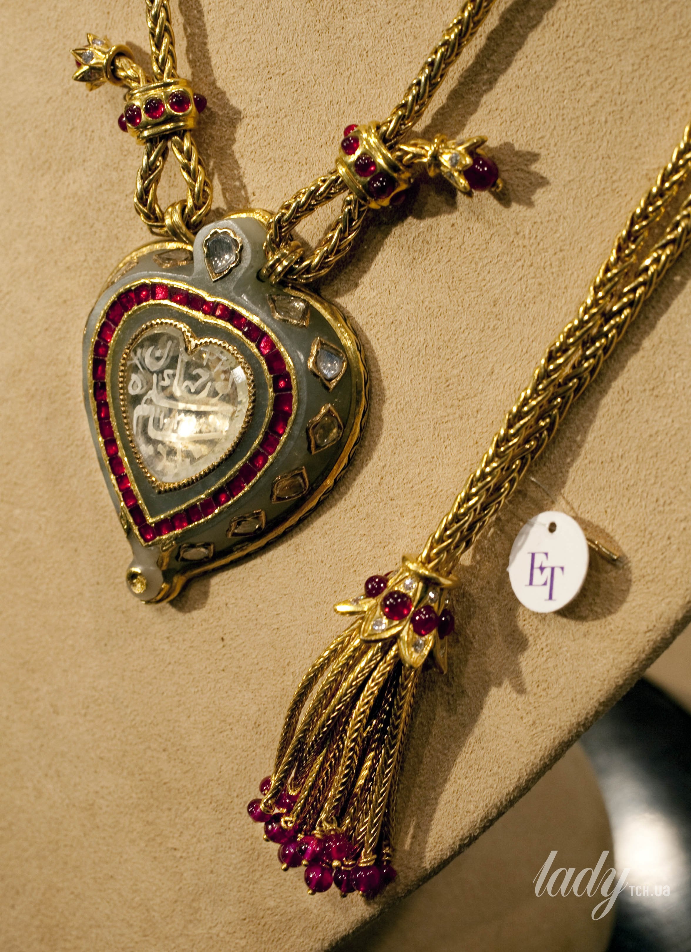 Роскошный кулон в форме сердца, инкрустированный нефритом и дополненный авторской цепочкой из золота, рубинов и бриллиантов, имеет надпись на языке парси: «Любовь вечна», а также имя Нур-Джахан — первой женщины, которая получила это украшение в подарок от своего мужа, могольского императора Шаха Джахангира. Драгоценность впоследствии перешла по наследству к их сыну Шаху Джахану, который подарил кулон своей жене Мумтаз-Махал, говорится на сайте Vogue.