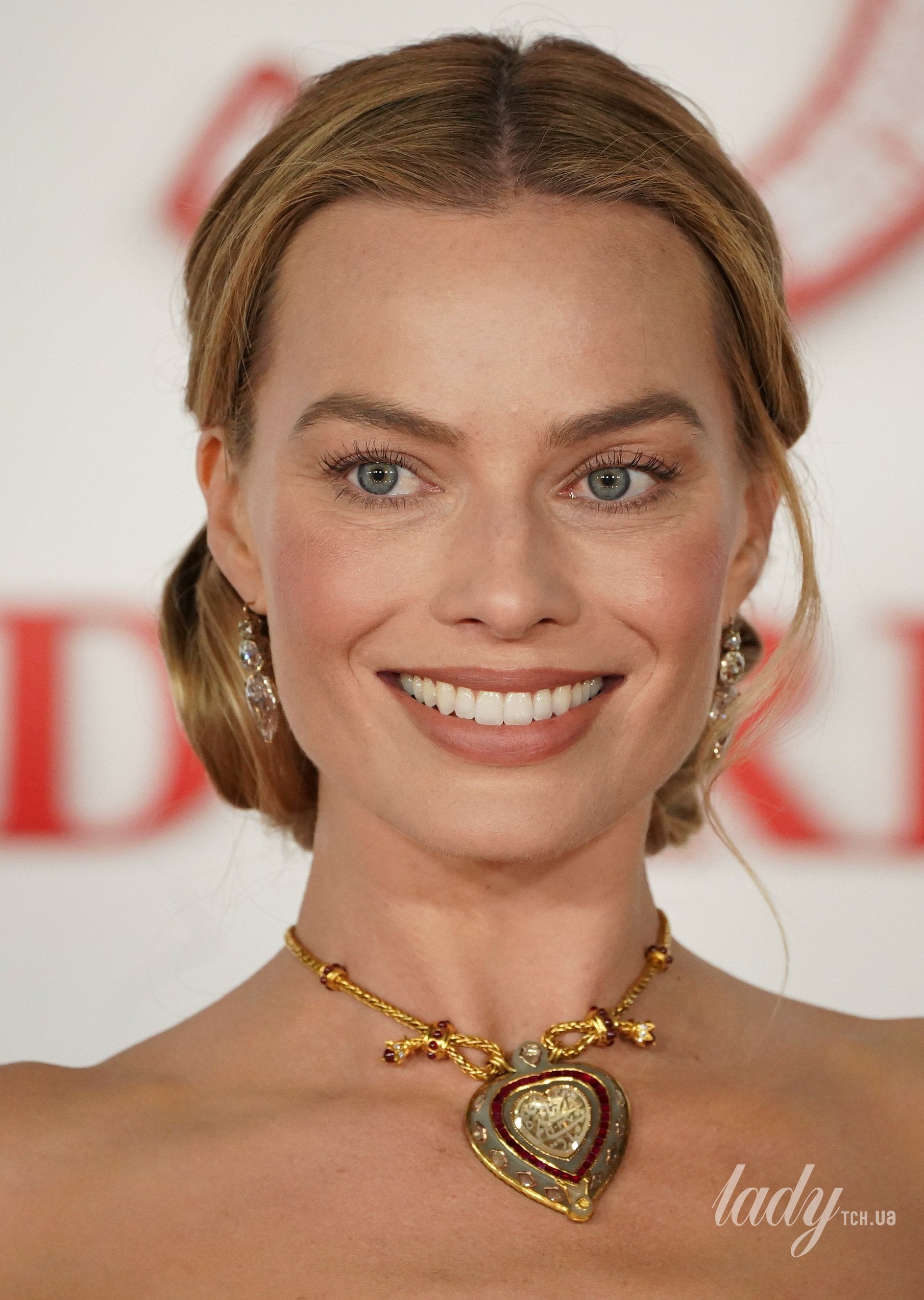 Однако не только роскошный наряд привлек внимание публики, ведь все же главной изюминкой образа Робби стало украшение на ее шее — колье в виде большого золотого сердца на цепочке.