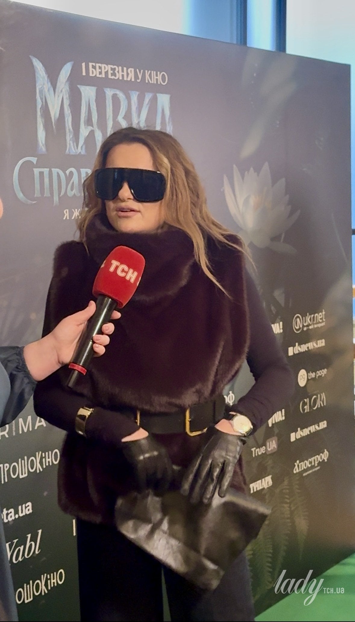 На звезде также были черные кожаные перчатки и черные остроносые туфли. Могилевская сделала волнистую укладку, нежный макияж, надела на лицо массивные черные очки, а на руки — браслет и часы. Свой лук она завершила черной сумочкой-клатчем.