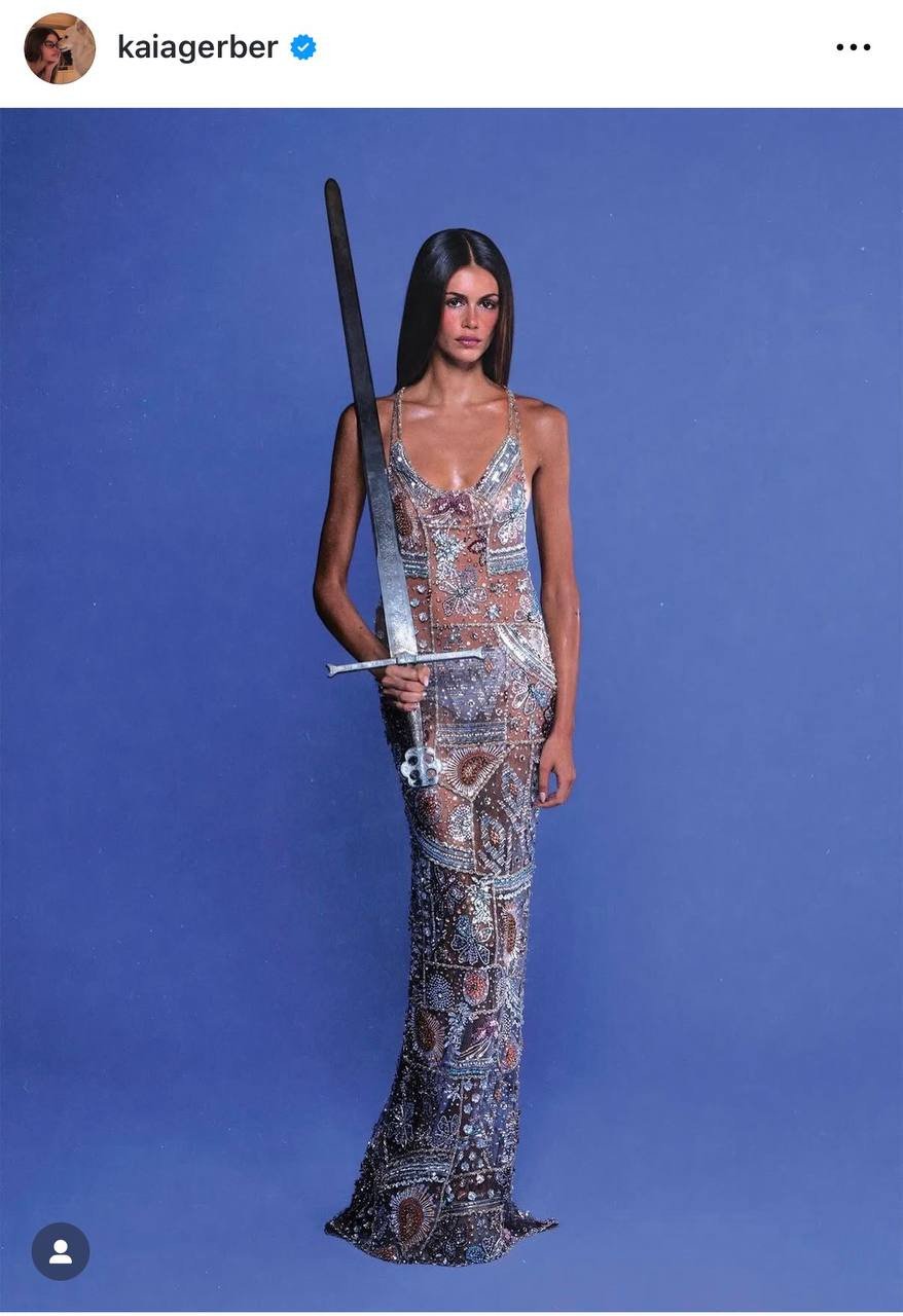 Неожиданно: Кайя Гербер позировала в прозрачном платье, расшитом бисером, и с мечом в руках