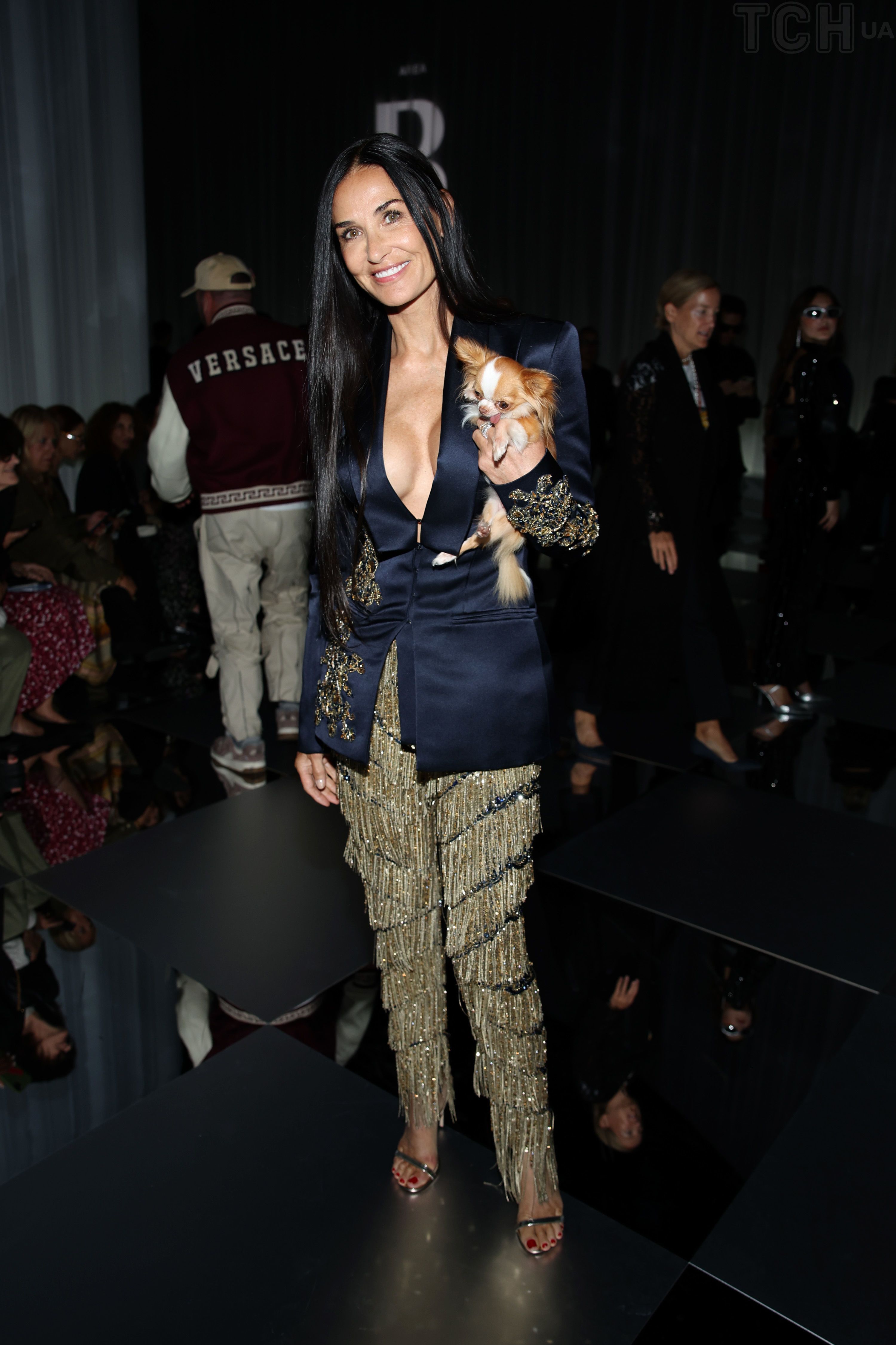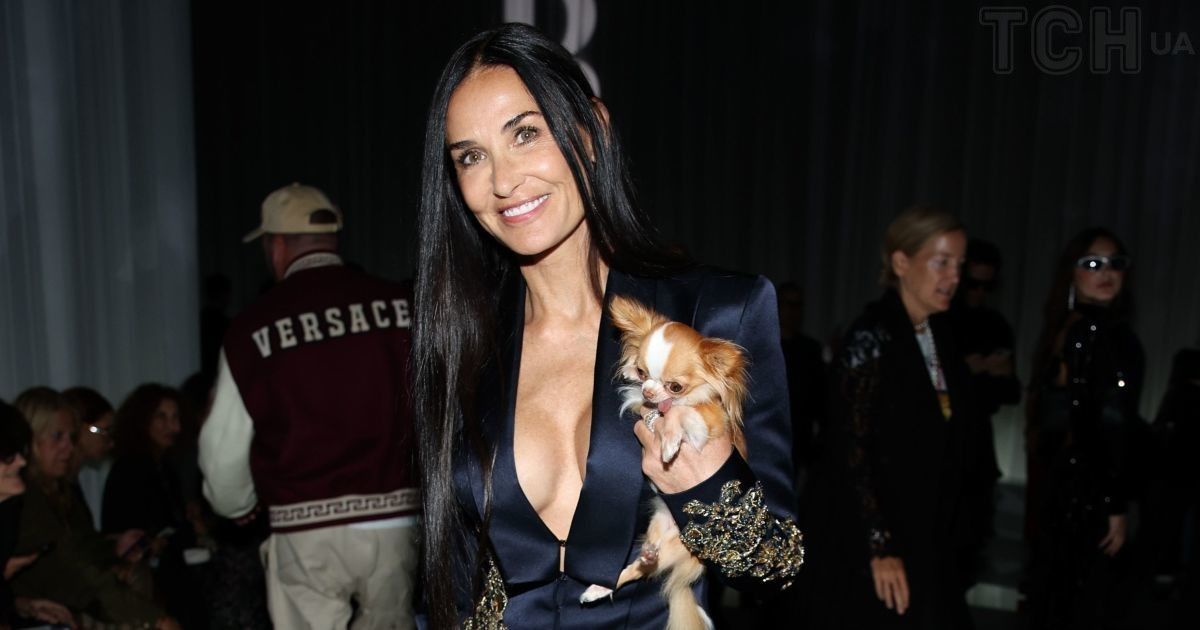 Ого, какая: 60-летняя Деми Мур пришла на модное шоу в жакете с откровенным декольте и собачкой под мышкой