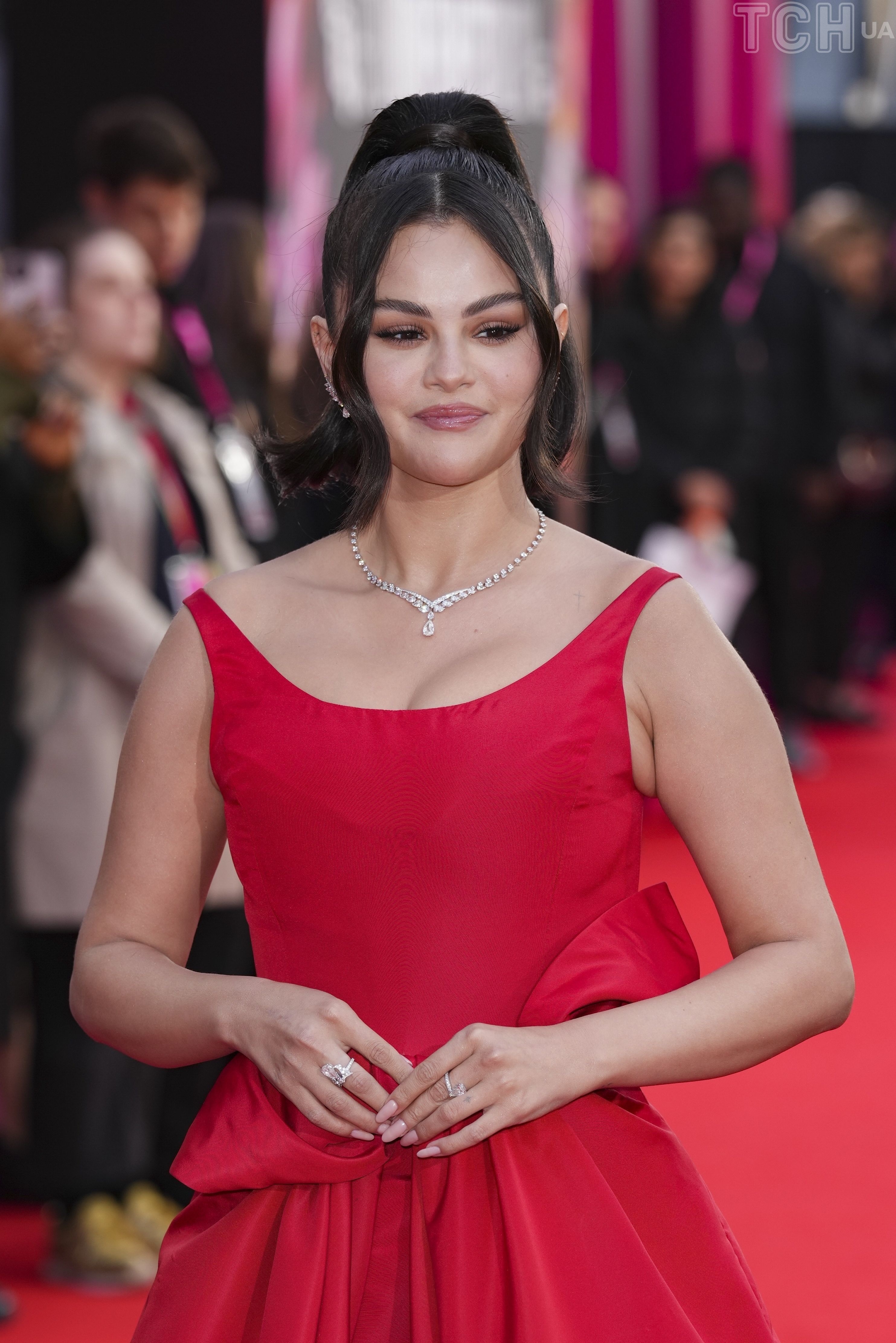 Она очаровательная: Селена Гомес надела рубиновое платье с бантом на талии на премьеру фильма