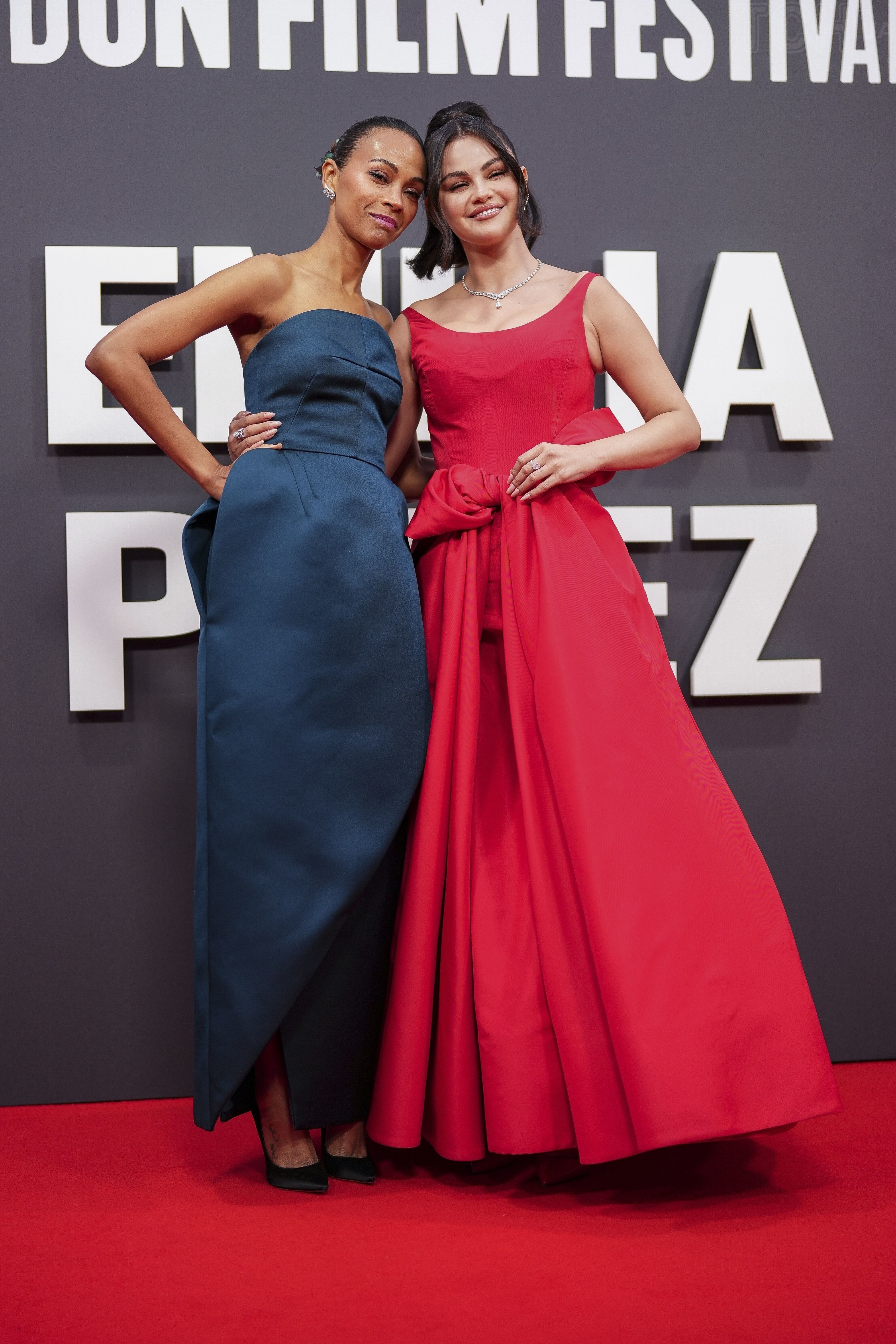 Во время мероприятия актриса также позировала с коллегами по фильму - Зои Салданой, которая надела роскошный наряд от Prada, Карлой Софией Гаскон, которая надела винное платье на одно плечо и Адрианой Пас.