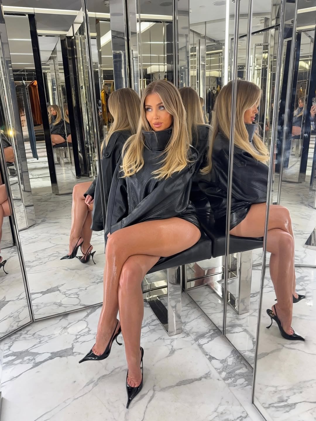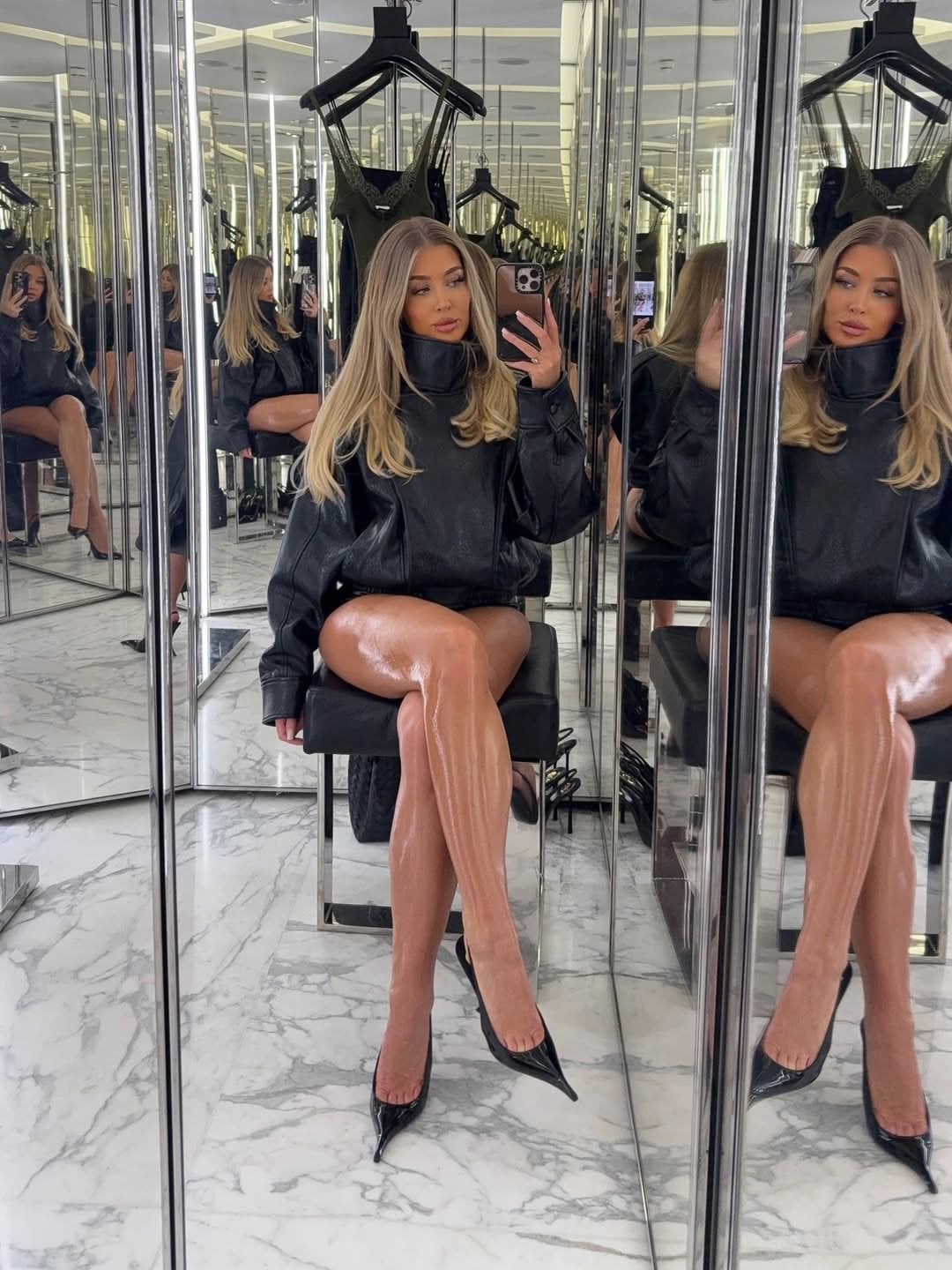 Позировала в примерочной: модель в кожаных мини-шортах похвасталась красивыми ногами, намазанными маслом