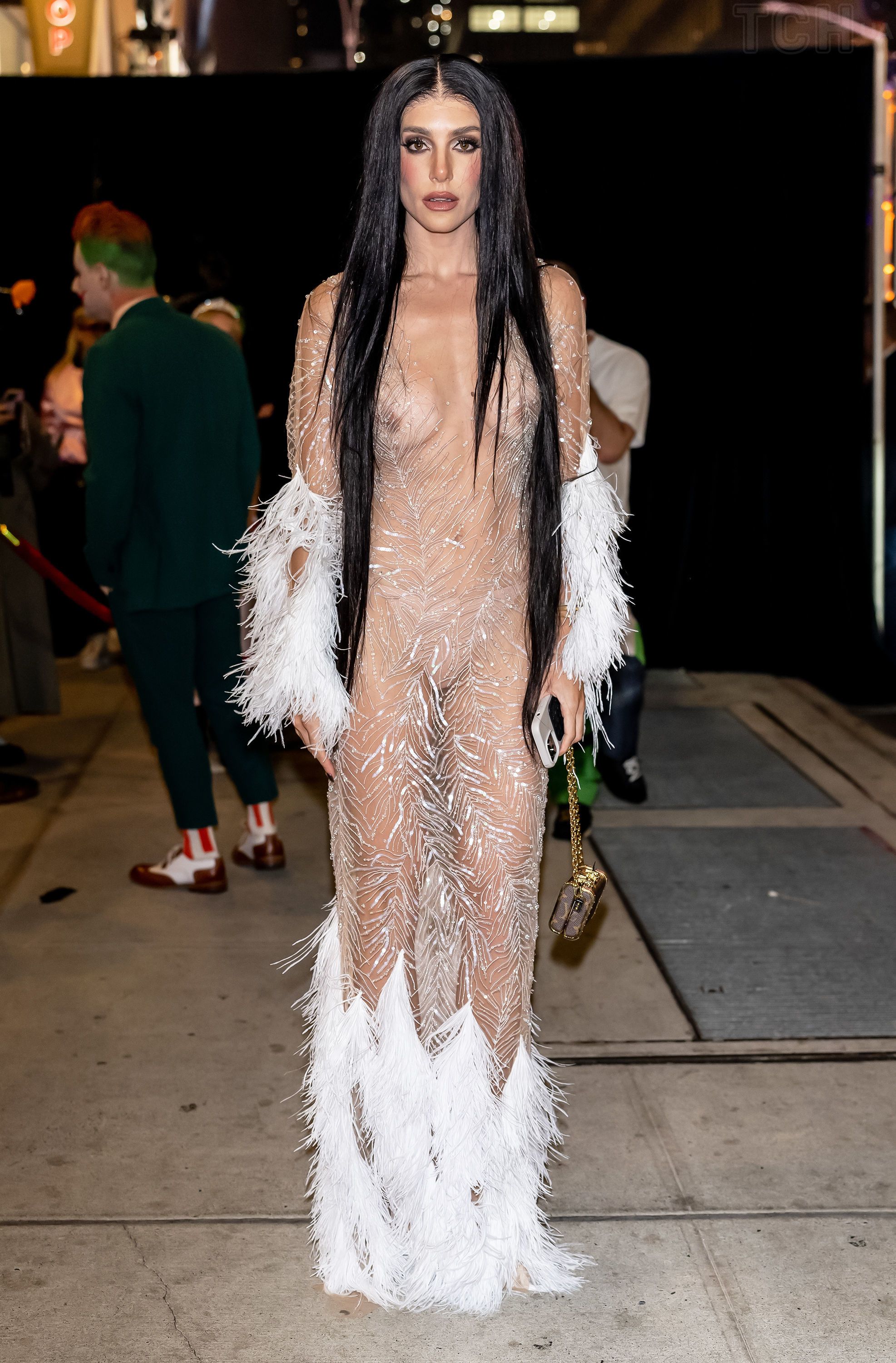 Для своего появления она выбрала откровенный аутфит. Девушка надела прозрачное платье макси, расшитое белым бисером и пайетками в виде веток, а также белыми перьями на рукавах и подоле. Под нарядом на ней были нюдовые трусы и не было бюстгальтера, поэтому Феррер сверкала обнаженной грудью и сосками перед собравшимися.