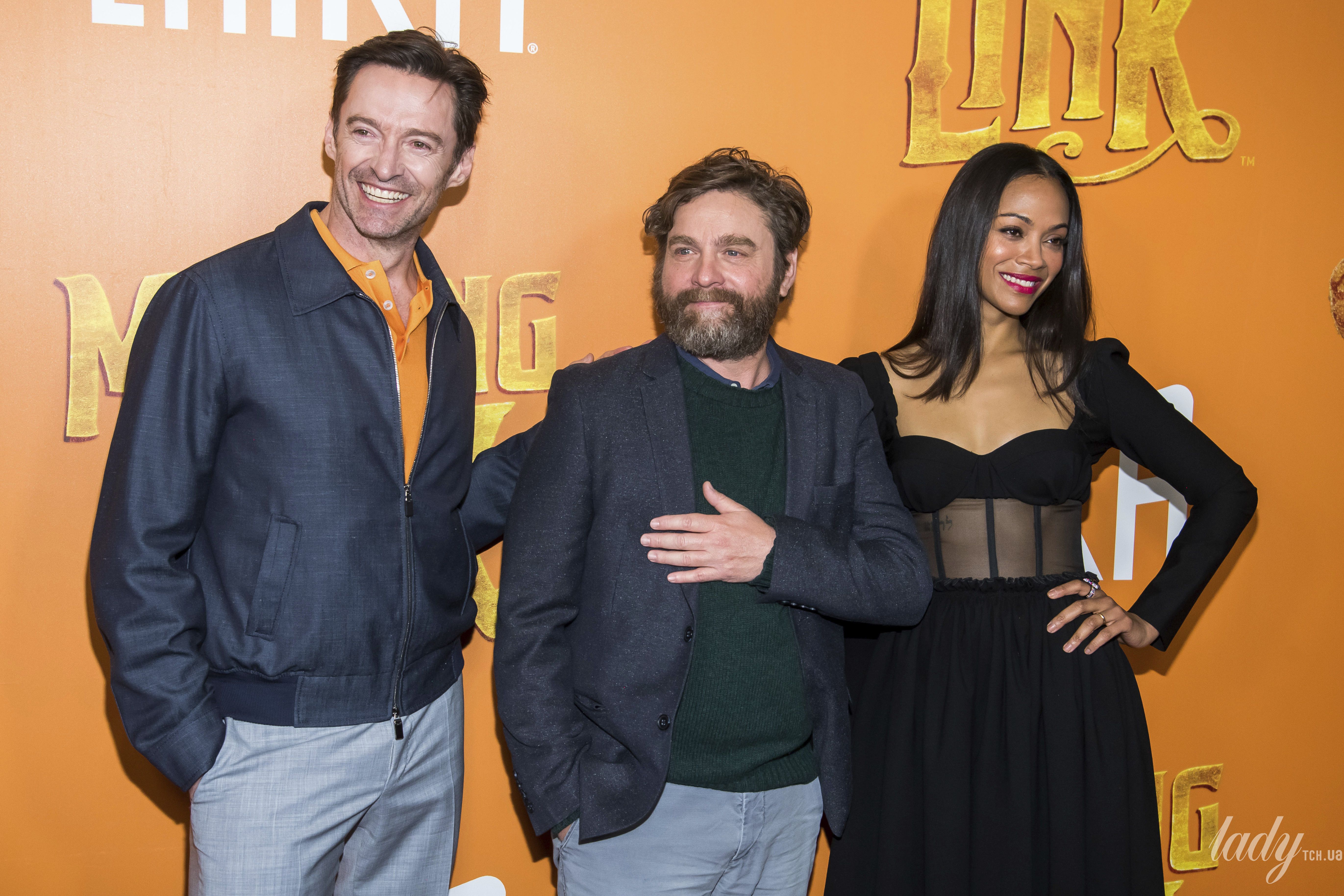 40-летняя актриса Зои Салдана вместе со своими коллегами Хью Джекманом и Заком Галифианакисом посетила премьерный показ фильма "Потерянное звено" в Нью-Йорке.