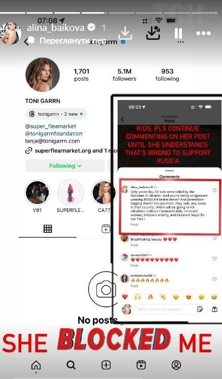 "Только вчера 40 детей были убиты россиянами в Украине. И ты продвигаешь и отмечаешь российские бренды? Они продают одежду, платят налог своей стране, который пойдет на убийства мирных украинцев, невинных женщин, детей и стариков. Это так низко, Тони!, - написала Байкова.