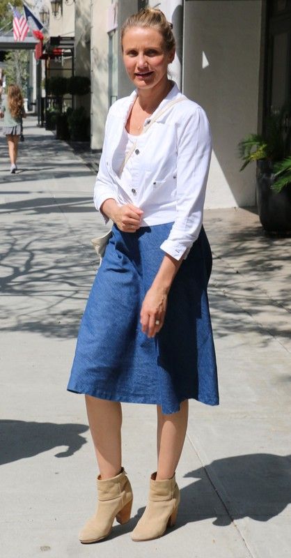 На ланч Камерон надела свободного кроя юбку и белую джинсовую куртку. К сожалению, беременность, о которой уже несколько месяцев пишут папарацци, не подтвердилась, живота у актрисы не видно.