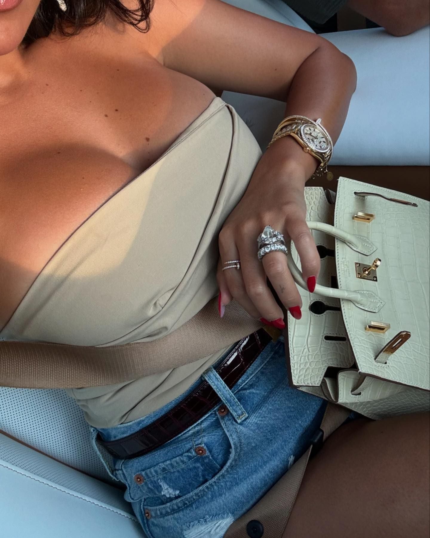 В этот раз пара решила организовать для себя романтическое свидание. Джорджина надела джинсовые мини-шорты, которые дополнила поясом Hermes, молочный топ-бюстье и лаковые нюдовые туфли на высоких шпильках. Свой гламурный образ она дополнила одной из своих многочисленных сумочек Hermès Birkin из крокодиловой кожи.