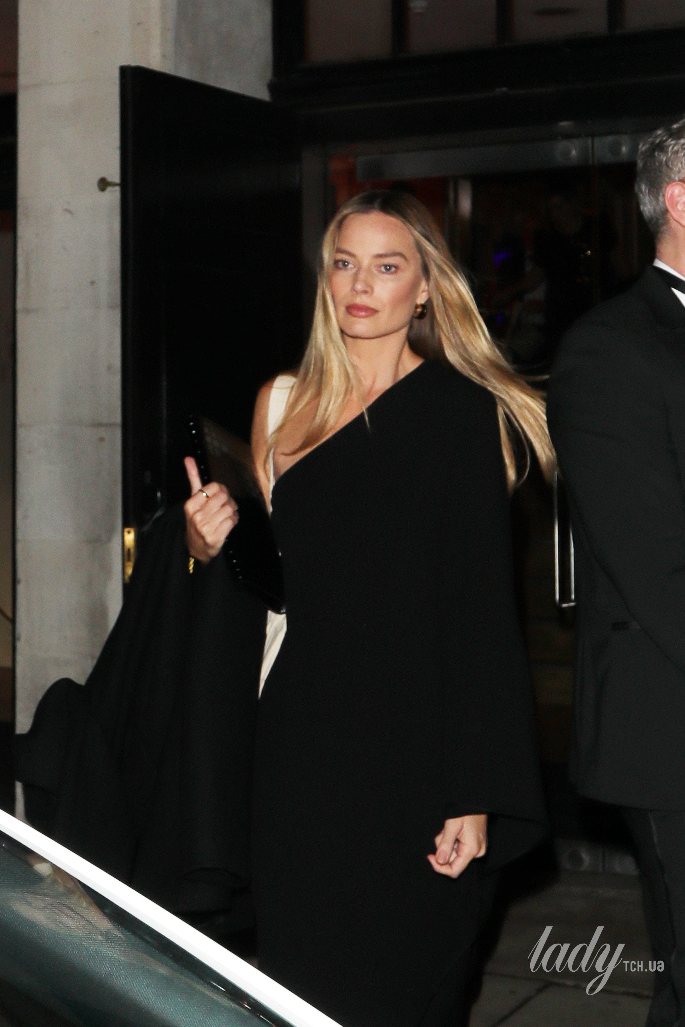 Марго надела лаконичное черное платье на одно плечо, которое также имело один рукав. Это был длинный наряд, который идеально отражал ее любовь к простоте, изысканности и сдержанному гламуру. Образ Робби дополнила босоножками со стразами на высоком каблуке, а также длинным черным пальто, которое несла в руках. Макияж Марго был простым и без акцентов и только подчеркивал ее естественную красоту. Из аксессуаров она также выбрала золотые серьги и черный клатч-концерт.